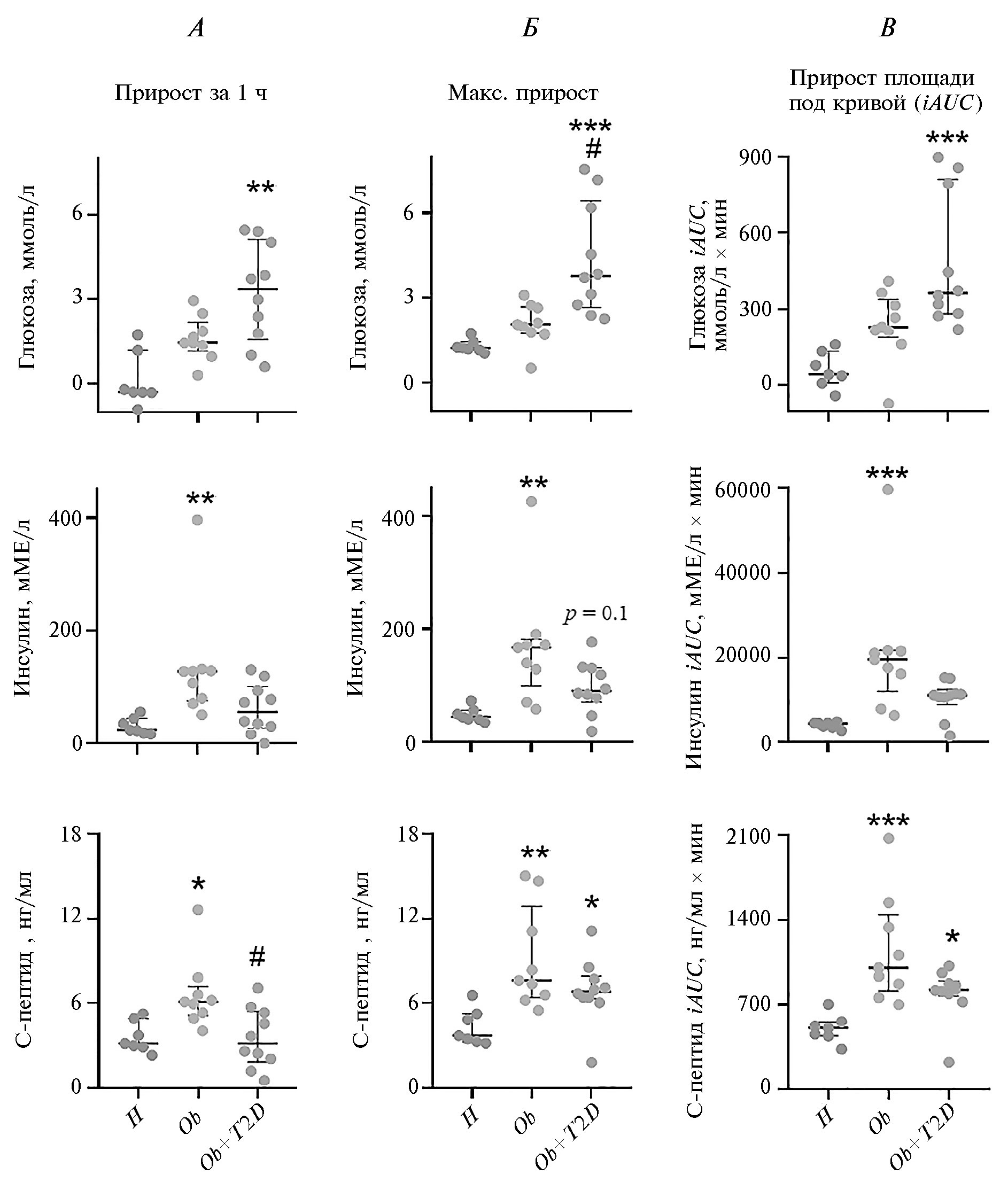 Рис. 2. Прирост глюкозы, инсулина и С-пептида в крови после приема смешанной пищи (6 ккал/кг массы тела) у худых добровольцев (Н), пациентов с ожирением без (Ob) и с сахарным диабетом 2-го типа (Ob + T2D).