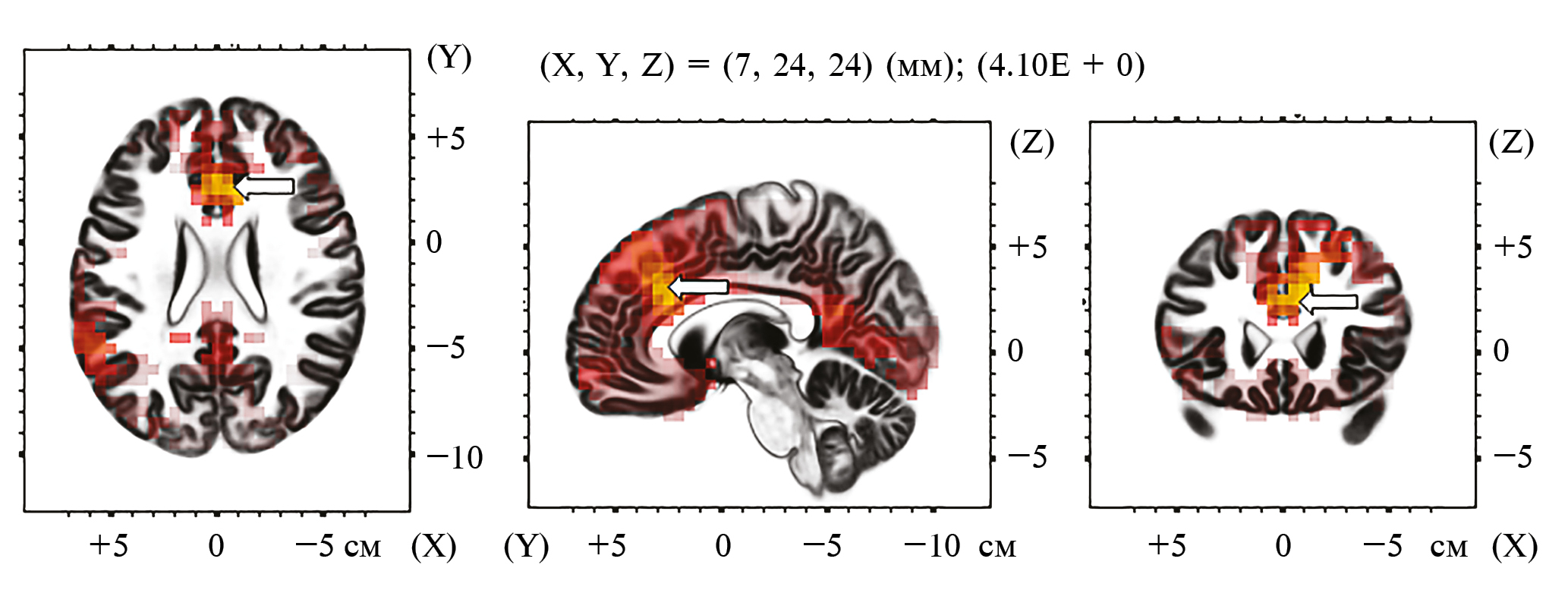 Выявленный результат увеличенной спектральной плотности θ-частотного диапазона в передней поясной коре (ППК) сочетается с известными фактами участия ППК в процессах внимания, мотивации [25], социальных [26] и основанных на награде процессах [27]. Так, в процессе игры в карты активность ППК была связана с мониторингом действий, сделанных другим игроком [27]. Согласно M.A. Apps и J. Sallet [28], нейроны ППК в большей степени участвуют в кодировании информации о последствиях действий других людей, чем о последствиях собственных действий или решений. Также, результаты нашего исследования согласуются с результатами фМРТ-исследования процессов конкуренции и кооперации, выполненного J. Decety et al., в котором было обнаружено увеличение активности передней поясной коры в процессе конкуренции [1].