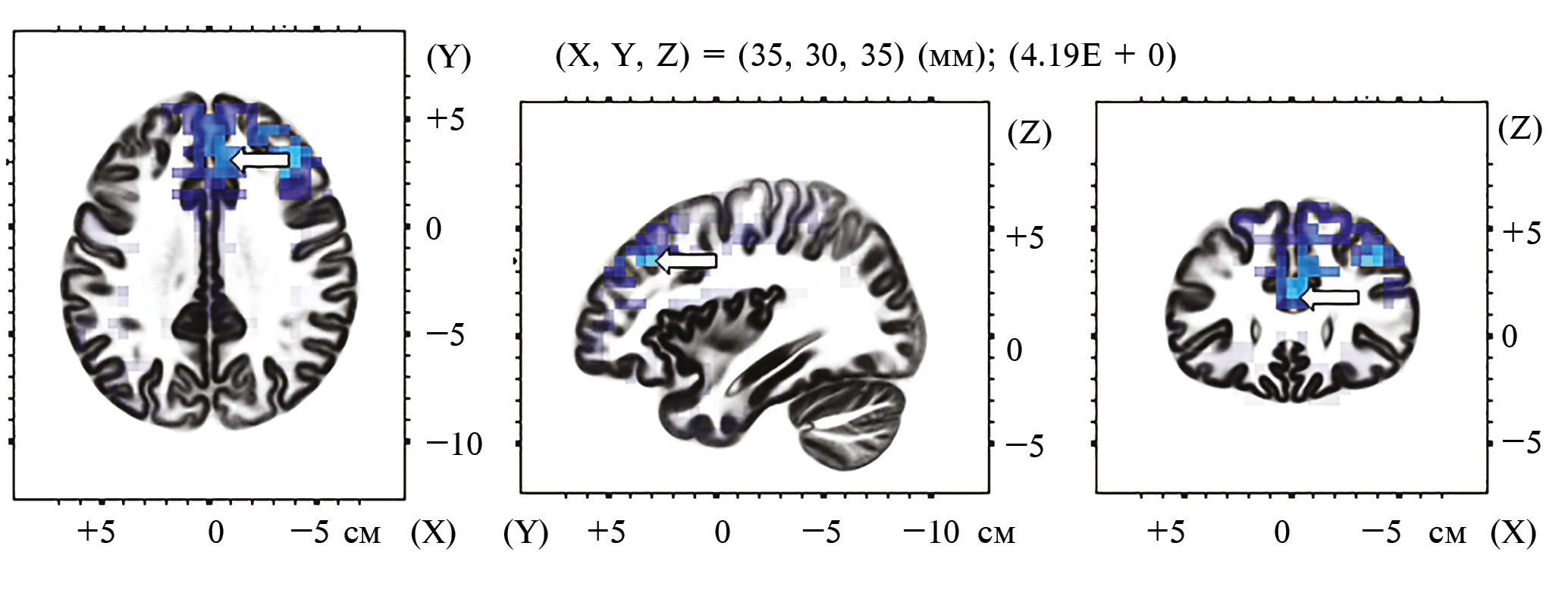 Во время конкуренции спектральная плотность α-частотного диапазона была меньше по сравнению с индивидуальным выполнением в теменных и затылочных областях коры (максимальный эффект был обнаружен в предклинье, область Бродмана 7) (рис. 3).