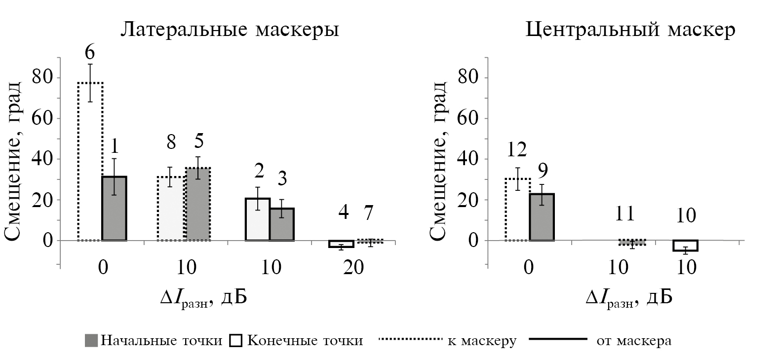 Пространственное освобождение от маскировки. Полученные нами данные подтверждают важнейшее свойство пространственной маскировки — ее ослабление при увеличении углового расхождения между маскером и сигналом. Воспринимаемое положение ближних к маскеру точек искажалось сильнее, чем дальних. Оценка эффекта маскировки как перцептивного сдвига НТ и КТ относительно их положения в тишине (рис. 3) показывает, что самая сильная маскировка наблюдается для КТ, ΔIс которых совпадают с ΔIм левого или правого маскера (ΔIразн = 0 дБ). Аналогично, в случае центрального маскера максимальный перцептивный сдвиг был для КТ сигналов с ΔIразн = 0 дБ. Минимальный эффект маскировки — для НТ и КТ при ΔIразн = 20 дБ относительно латеральных маскеров, либо ΔIразн = 10 дБ относительно центрального маскера.