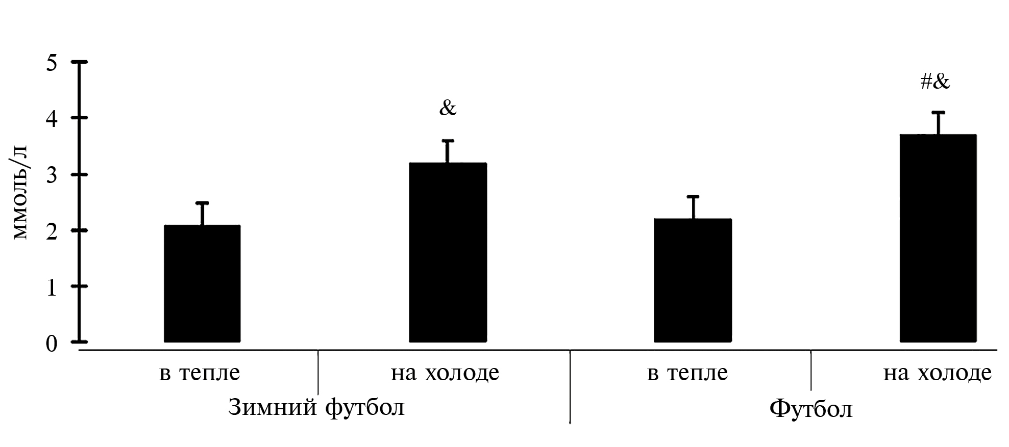 Рис. 1. Концентрация молочной кислоты в капиллярной крови спортсменов, Me (Q1–Q3). * – достоверность различий в покое и после нагрузки (р ≤ 0.05). # – достоверность различий между группами Футбол и Зимний футбол после нагрузки (р ≤ 0.05). & – достоверность различий между показателями в тепле и на холоде (р ≤ 0.05).