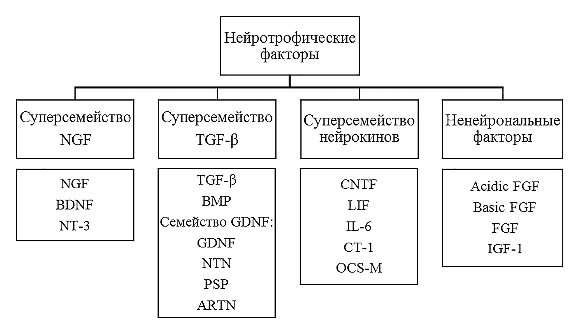 К нейротрофическим факторам относят суперсемейства фактора роста нервов (NGF), трансформирующего ростового фактора бета (TGF-β) и нейрокинов, а также ненейрональные факторы (рис. 1) [14, 15].