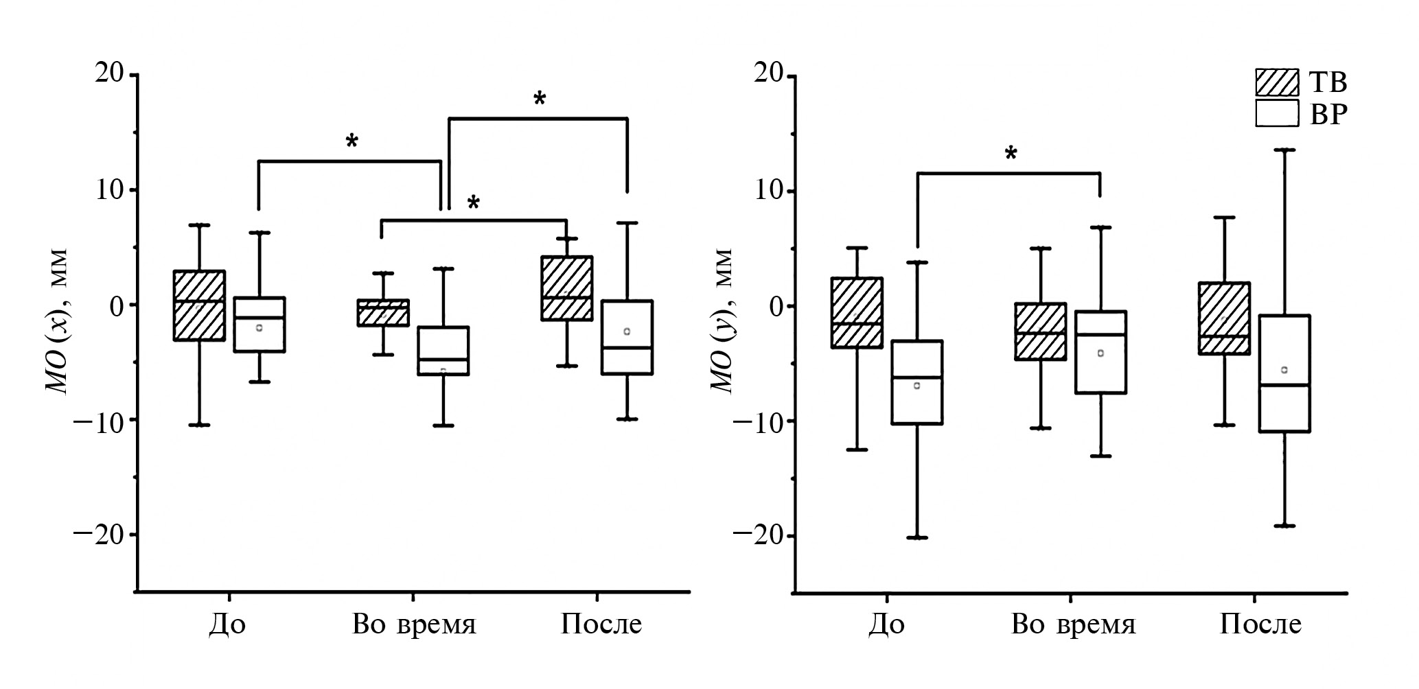 Проведен анализ смещения ЦД по оси Х (фронтальная плоскость, МО (х)) и по оси Y (сагиттальная плоскость, МО (y)), этот показатель, по литературным данным, может быть информативным при описании изменения равновесия в ответ на движущиеся в разном направлении стимулы [28, 29] (рис. 1).