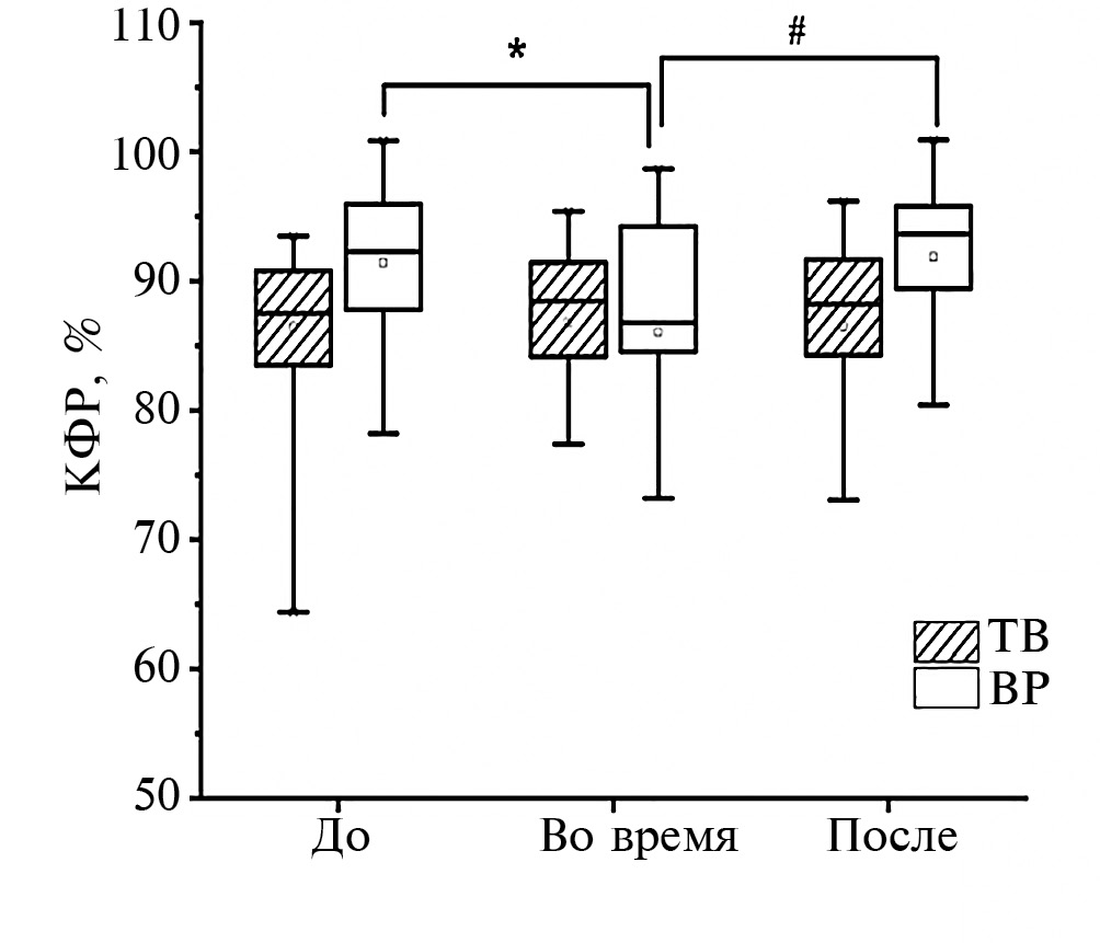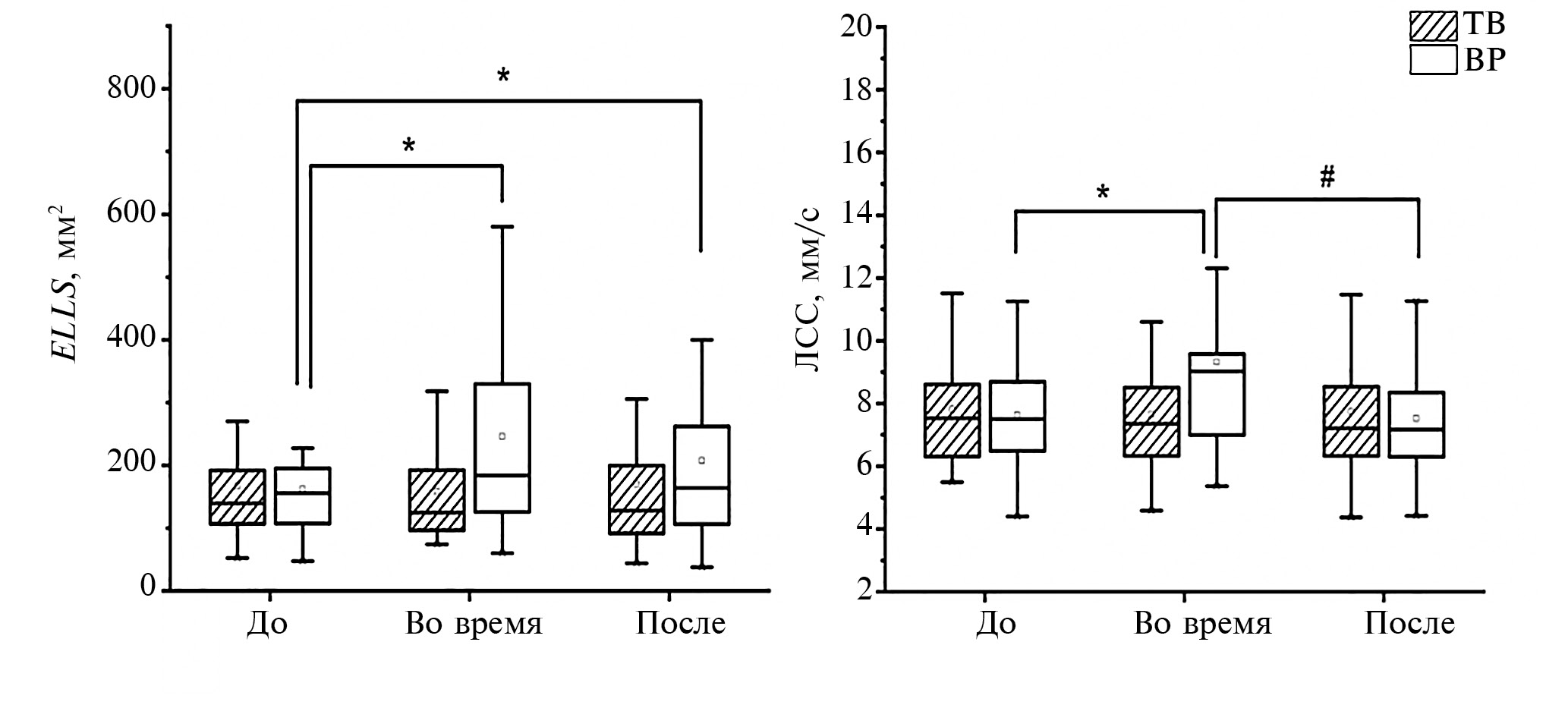 Заштрихованные столбики – при просмотре видео с экрана телевизора (ТВ); белые столбики – при просмотре видео в шлеме виртуальной реальности (ВР); данные представлены в виде медианы, разброс в группах — в виде интерквартильного размаха, усы — минимальное и максимальные значения, точка внутри бокса — среднее значение, точка за пределами бокса – выброс; * – р ≤ 0.05, достоверность различий.