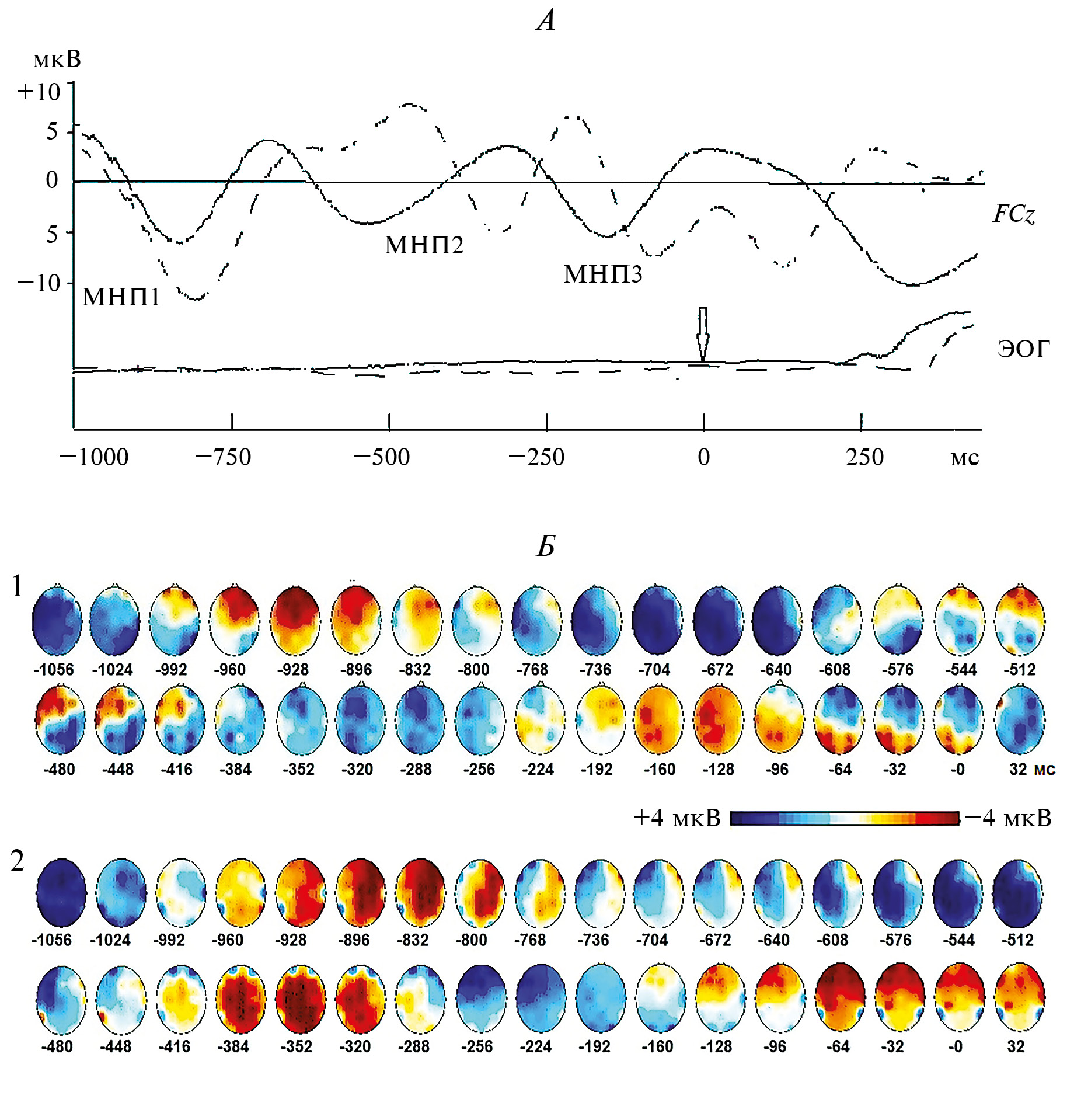 А — усреднение ЭЭГ у здоровых испытуемых (сплошная линия, n = 279) и больных (пунктирная линия, n = 281). Стрелка обозначает включение целевых стимулов (ЦС) (триггер усреднения, 0 мс). Б – фрагмент ЭЭГ картирования амплитуды медленных потенциалов в предстимульном интервале в группе нормы (1) и в группе больных (2). Шаг картирования 32 мс. 1 – красные фокусы в интервале от –992 до 800 мс — компонент МНП1, от –608 до –384 – компонент МНП 2, от –224 до 0 мс — компонент МНП3. 2 – красные фокусы в интервале от –960 до –608 мс — компонент МНП1, от –448 до –288 – компонент МНП 2, от –128 до 0 – компонент МНП3.