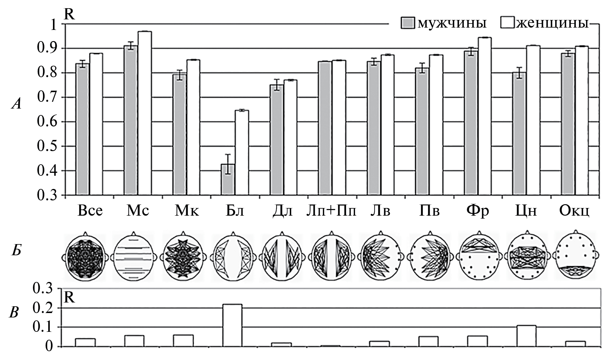 Рис. 1. Межиндивидуальное сходство пространственной организации ЭЭГ у мужчин и женщин (половые различия). А – средние величины коэффициентов межиндивидуального сходства 11 выделенных пространственных структур дистантных взаимосвязей ЭЭГ в группе мужчин (серые столбики) и в группе женщин (белые столбики) в основных комбинациях связей ЭЭГ. По вертикали – средние значения оценок межиндивидуальной корреляции R, анализируемые в группе из 15 мужчин по 105 внутрипарным корреляциям, а в группе из 23 женщин – по 253 корреляциям; по горизонтали – обозначения комбинаций связей ЭЭГ. Доверительные интервалы оценивались по t-критерию Стьюдента с применением z-преобразования Фишера, при p = 0.05. Б – схемы 11 выделенных комбинаций межрегиональных связей ЭЭГ (обозначения в тексте методики). В – половые различия в степени межиндивидуального сходства 11 пространственных структур дистантных взаимосвязей ЭЭГ, оцениваемых в группах мужчин (n = 15) и женщин (n = 23), по вертикали – средние значения межиндивидуальной корреляции R.
