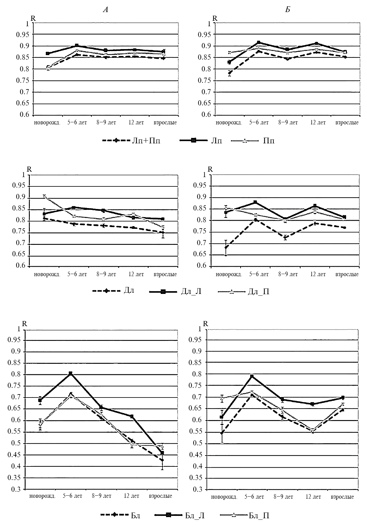 Особый интерес представляет изучение степени сходства у разных индивидуумов пространственной организации межрегиональных взаимодействий потенциалов мозга при оценке КМС в отдельности по каждому из полушарий. Из трех комбинаций внутриполушарных связей, оцениваемых одновременно в пределах обоих полушарий – «Лп+Пп», «Дл» и «Бл» – были сформированы шесть дополнительных комбинаций дистантных связей ЭЭГ, выделенных в отдельности для левого и правого полушария: «Лп», «Пп», «Дл_Л», «Дл_П», «Бл_Л», «Бл_П». Оценки межиндивидуального сходства организации ЭЭГ как у взрослых, так и у детей показали, что при «разделении по полушариям» дистантных связей ЭЭГ величины КМС значимо увеличиваются для тех же самых групп испытуемых (рис. 4, табл. 1). Существенно, что такой «гемисферный принцип» выполняется как для оценок КМС, проведенных для удаленных внутриполушарных взаимодействий («Дл_Л», «Дл_П»), так и для ближних связей ЭЭГ («Бл_Л», «Бл_П»), так и при их объединении в общую структуру связей в пределах каждого из полушарий («Лп», «Пп»). Такой принцип повышения межиндивидуального сходства пространственной организации ЭЭГ в пределах одной и той же группы испытуемых при разделении межрегиональных связей потенциалов мозга на принадлежащие в отдельности либо левому, либо правому полушарию выполняется как в группах мужчин, так и женщин, мальчиков и девочек разного возраста, т.е. независимо от пола испытуемых. Однако следует подчеркнуть, что для комбинации ближних связей ЭЭГ («Бл») гемисферный принцип как у лиц мужского пола, так и у лиц женского пола во всех изучаемых нами возрастных группах, даже у новорожденных, выполняется в основном только по левому полушарию, т.е. для комбинации «Бл_Л». По правому полушарию значения КМС для «Бл_П» и «Бл» почти полностью совпадают (рис. 5).