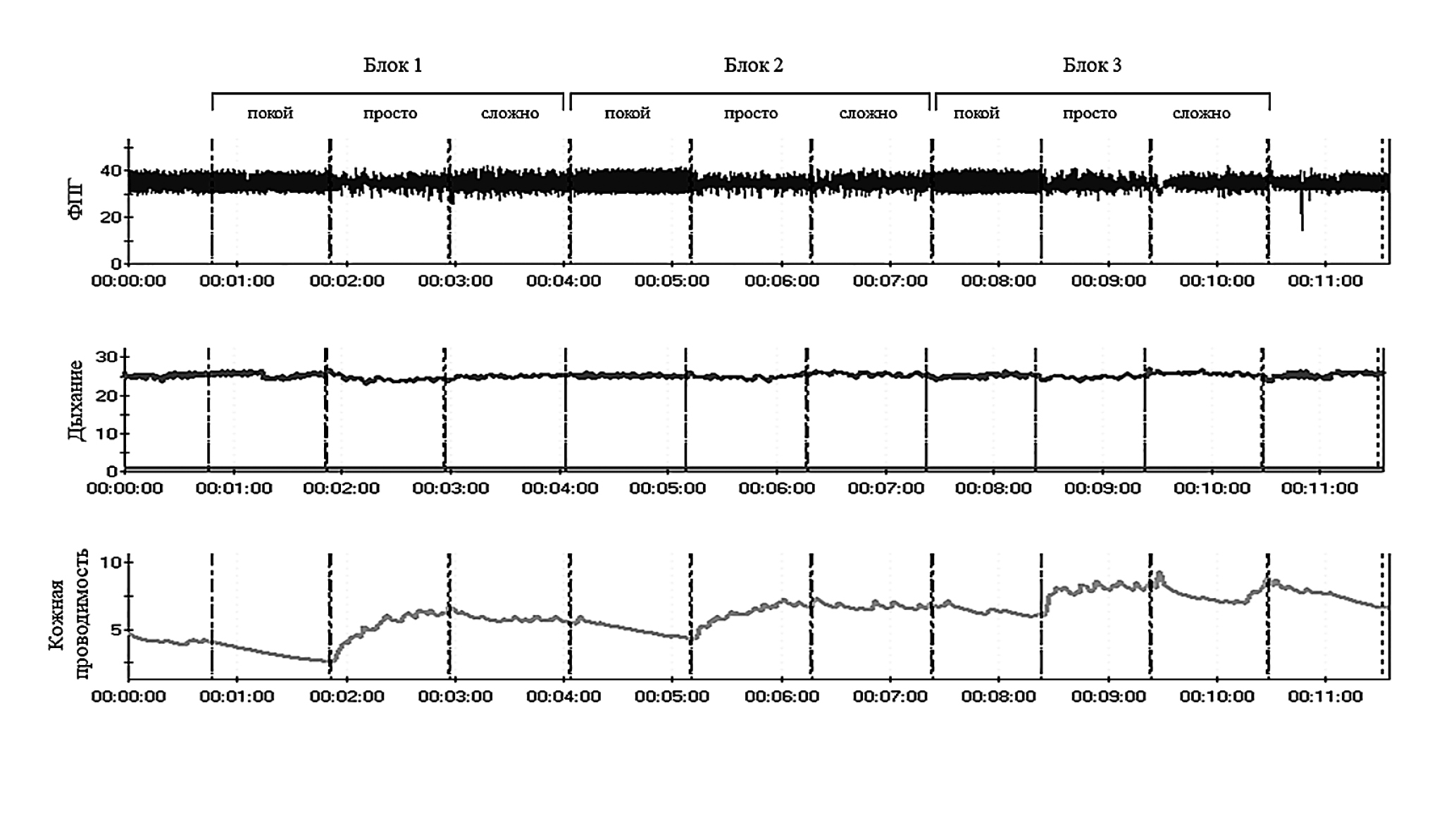 После инструктажа и закрепления фотоплетизмографического (ФПГ) и пневмографического датчиков начиналась непрерывная запись физиологических показателей, которая завершалась только по окончании исследования. Участникам предлагали последовательно выполнить три блока упражнений, состоящих из равных по времени (60 с) этапов: периода относительного покоя, простого задания и сложного задания. Общая схема эксперимента и пример записи физиологических показателей представлены на рис. 1.