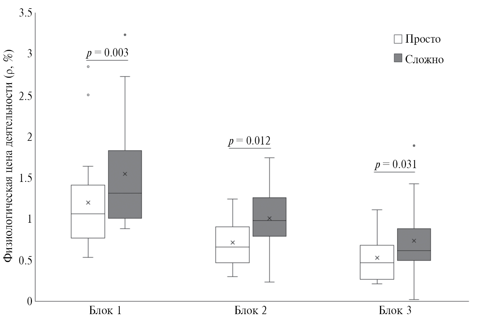 Рис. 2. Физиологическая цена выполнения простого и сложного задания. Использован непараметрический ранговый критерий Уилкоксона. Уровень статистической значимости (p) принимали равным 0.05.