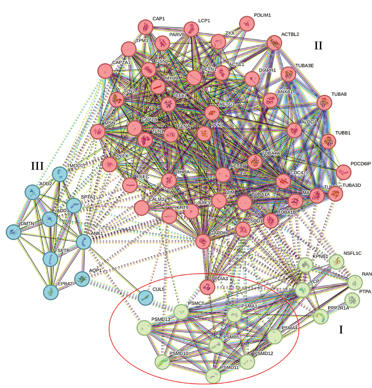 7. Fig. 6. Interactions of 10 proteins disappearing or appearing during spaceflight (PSMD10) (enclosed in an oval), related to processes whose abundance was significantly reduced during spaceflight (SF) (immune system, proteasomes, and metabolism), with cytoskeletal organizing proteins. Clustering was performed using the k-means method.