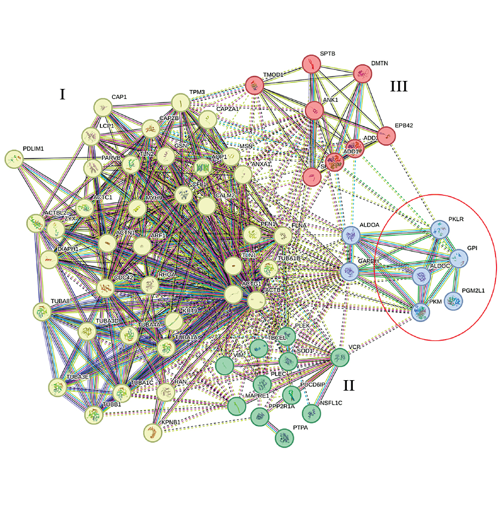 9. Fig. 8. Interactions of 5 proteins related to energy processes, the abundance of which significantly decreased during spaceflight (circled), with cytoskeletal organization proteins. Clustering was performed using the k-means method.