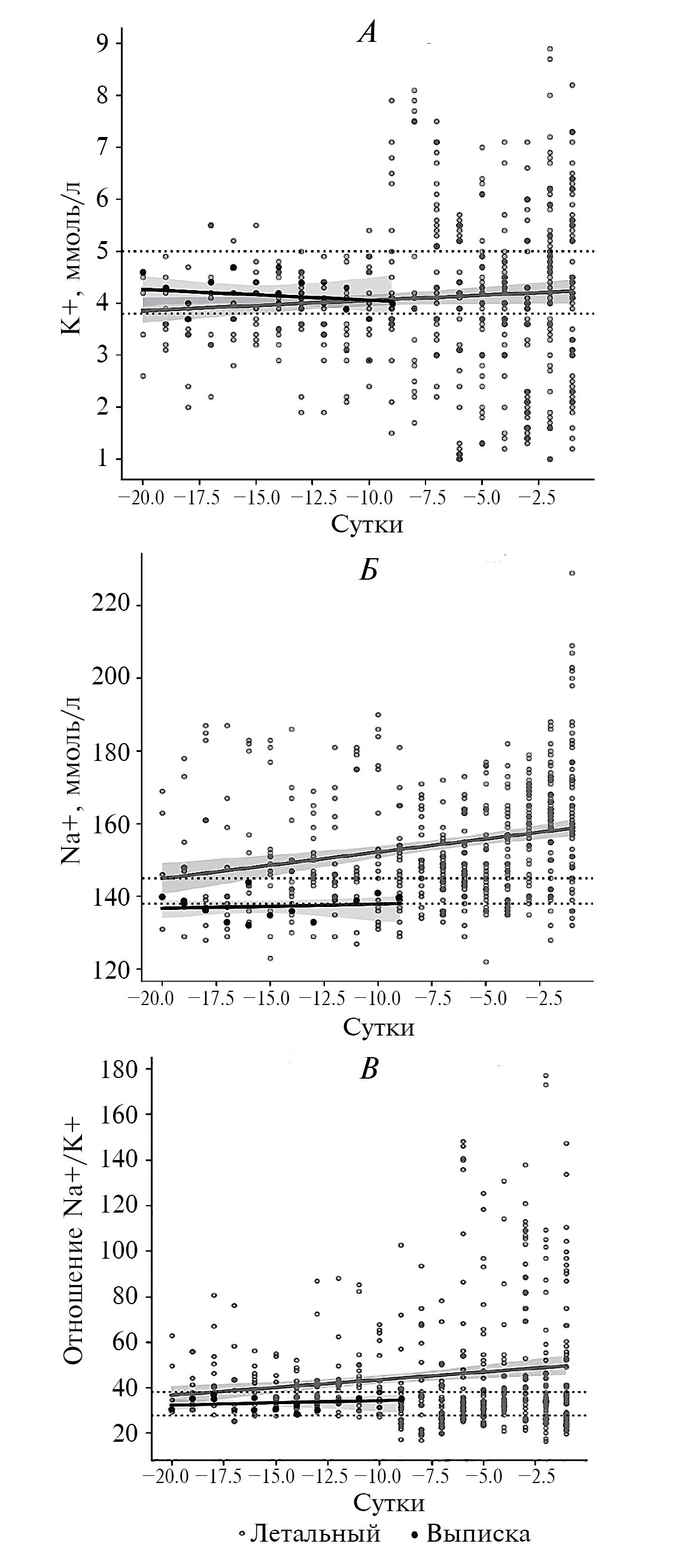 Рис. 1. Динамика и индивидуальные значения концентрации электролитов и их соотношения в плазме крови за период 20 сут до определившегося исхода. А – калий; Б – натрий; В – соотношение натрий/калий