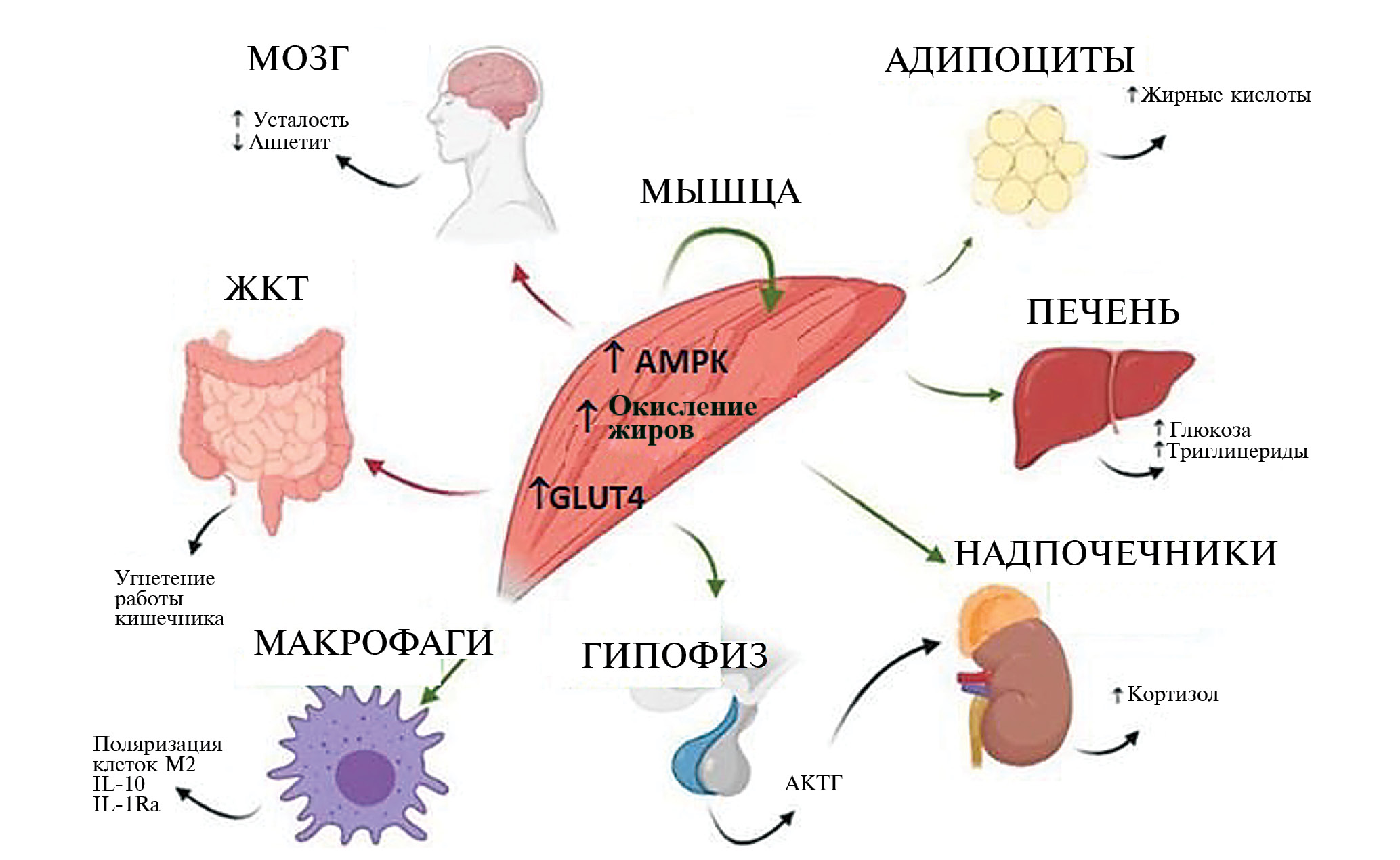 Еще одним эндокринным механизмом влияния IL-6 на организм при физической активности является обеспечение перекрестных взаимодействий между мышцами и другими органами [48]. Одним из таких органов является жировая ткань, которая является источником многих провоспалительных медиаторов, вызывающих хроническое воспаление при заболеваниях, связанных с низким уровнем физической активности, например сахарный диабет 2-го типа [49]. Показано, что инфузия IL-6 способствует липолизу и приводит к повышенному высвобождению жирных кислот в кровоток [50]. При физических нагрузках IL-6 может подавлять провоспалительное действие адипоцитов и мобилизовать жирные кислоты, которые затем могут использоваться работающими мышцами в качестве метаболических субстратов.