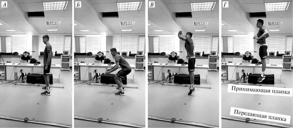 Рис. 1. Выполнение испытуемым прыжка вверх с подседом и с махом руками. А – исходное положение испытуемого. Б – момент подседа до угла в коленном суставе 90° (положение приседа). В – завершающая фаза отталкивания (выполнение прыжка). Г – достижение максимальной высоты прыжка.
