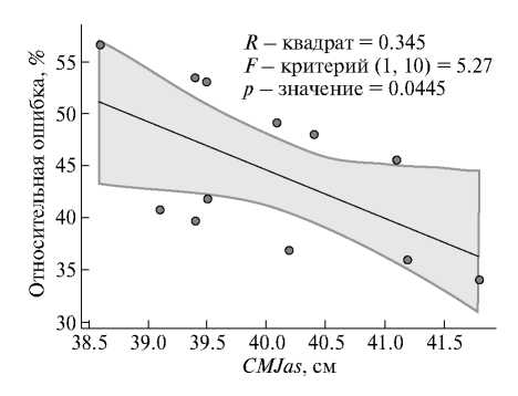 Рис. 5. Взаимосвязь максимальной высоты прыжка и относительной ошибки в прыжках типа CMJas до воздействия антиортостатической гипокинезии.