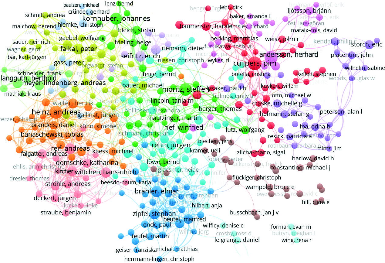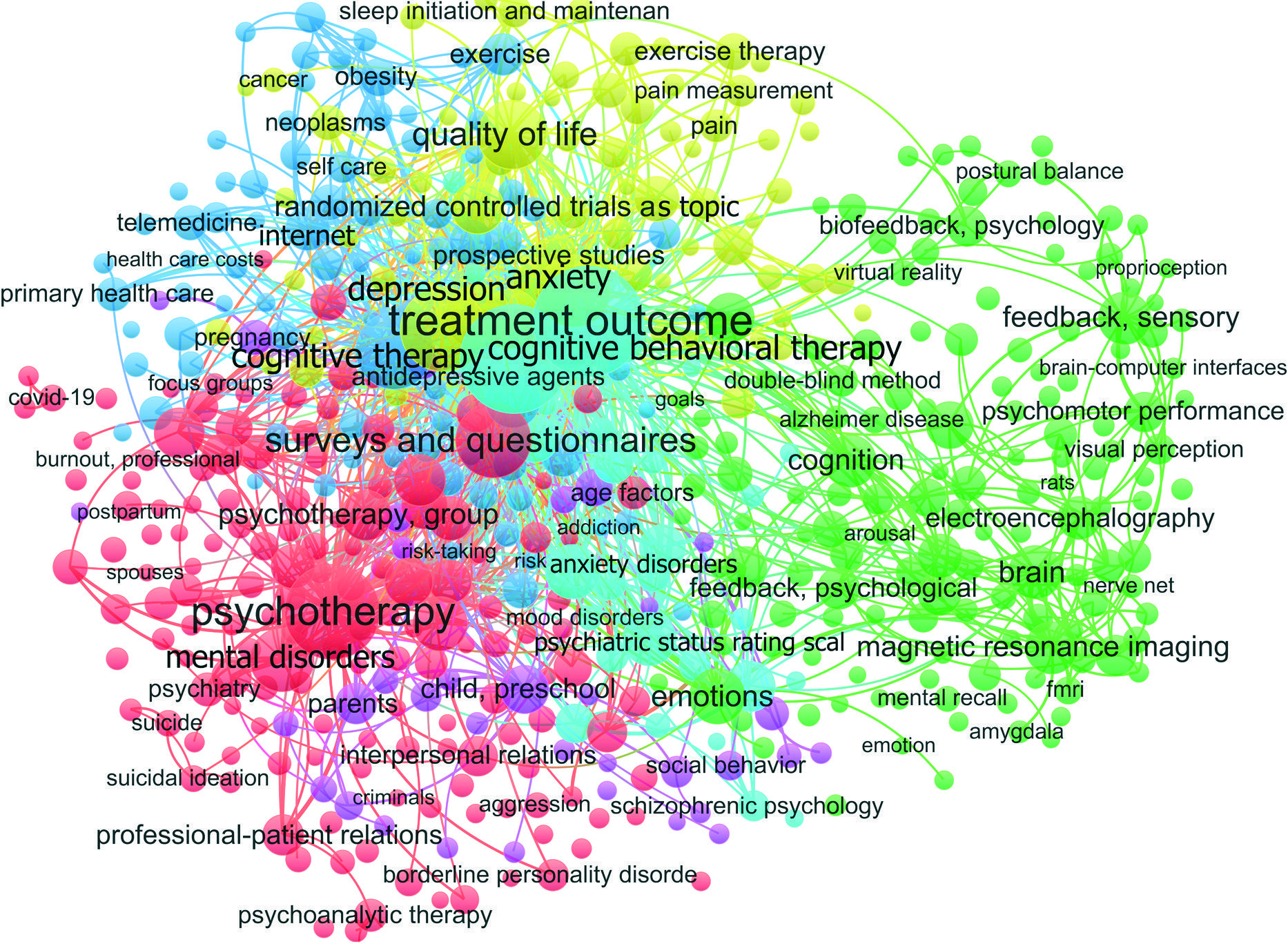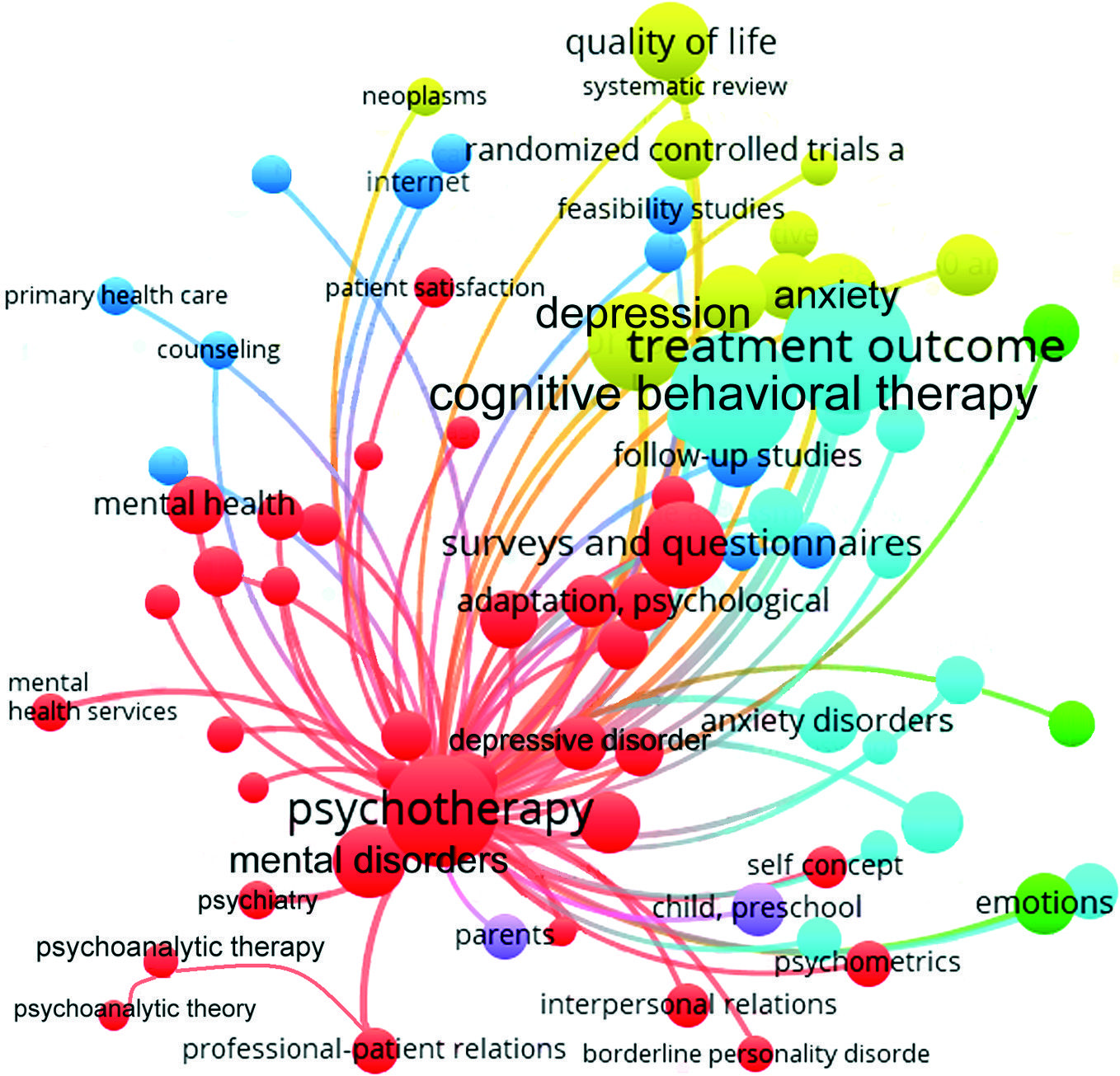 Methods. The PubMed database search produced a sampling of 89.8 thousand items referring to international papers on psychotherapy published within the span of 10 years, from 2012 to 2021. We analyzed 88.6 % of the yielded sampling. Within the co-occurrence network of 250 keywords and 40 scientific publications, either by individual authors or co-authored, the VOSviewer software tool allowed to visualize 6 clusters based on terms and 14 clusters based on most prominent co- authorship links between researchers.
