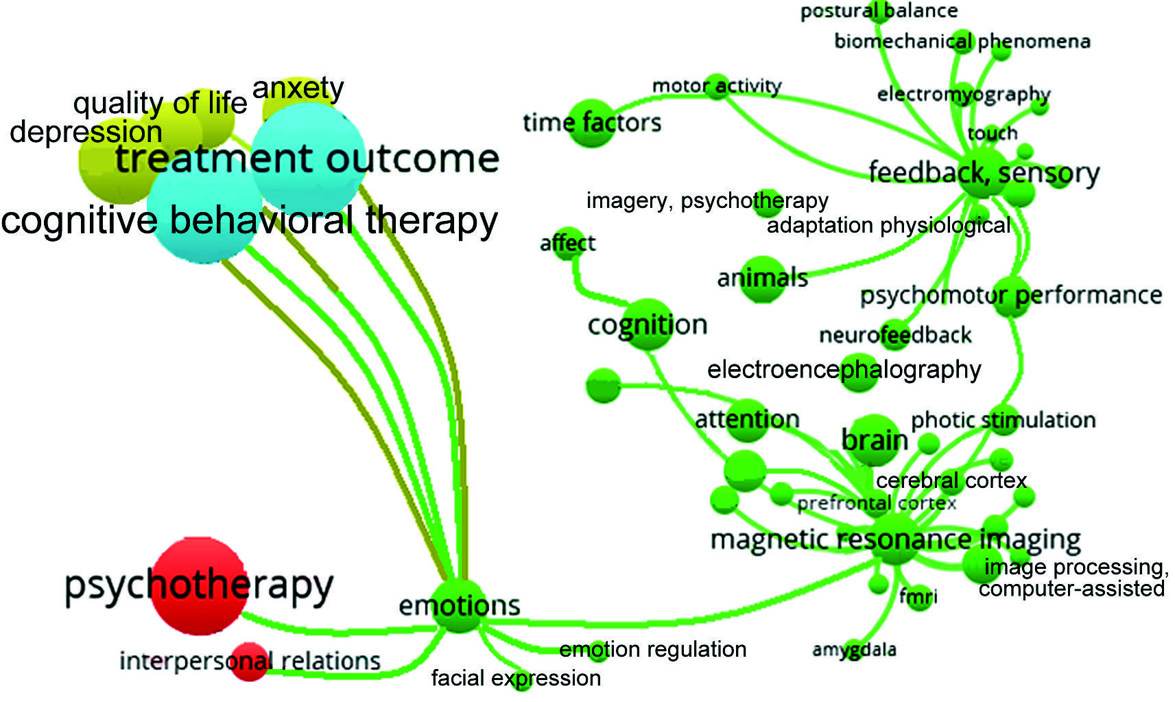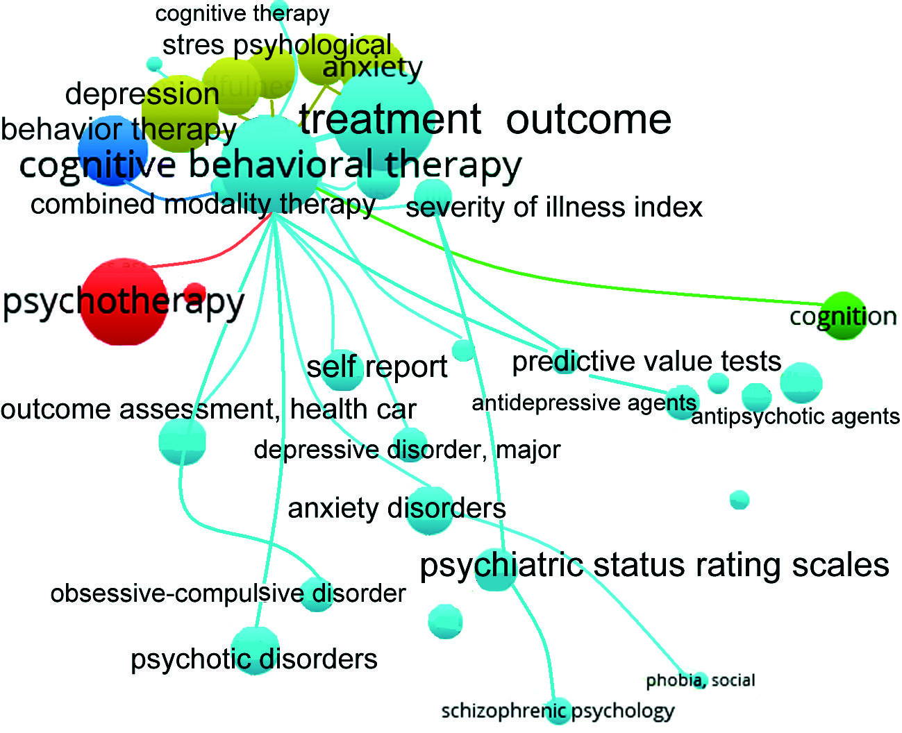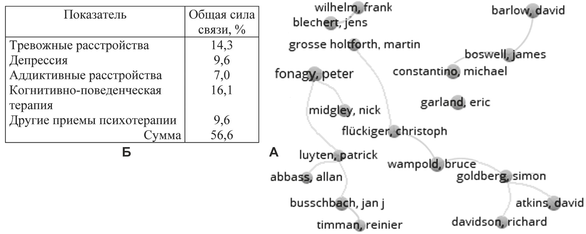 Исходя из числа общей силы связи, рассчитали вклад влияния кластеров и групп научных соавторств в массив публикаций по психотерапии. На основе ключевых слов или соавторства программа VOSviewer позволяла наглядно показать взаимные связи изучаемых терминов и создавать кластеры публикаций. Диаметр маркера изучаемого термина (ключевого слова или автора) зависит от количества статей, а толщина линий между маркерами – от силы связей, т.е. числа встречаемости их вместе в публикациях. При наведении курсора на эти графические изображения во всплывающем окне появлялись цифровые показатели.