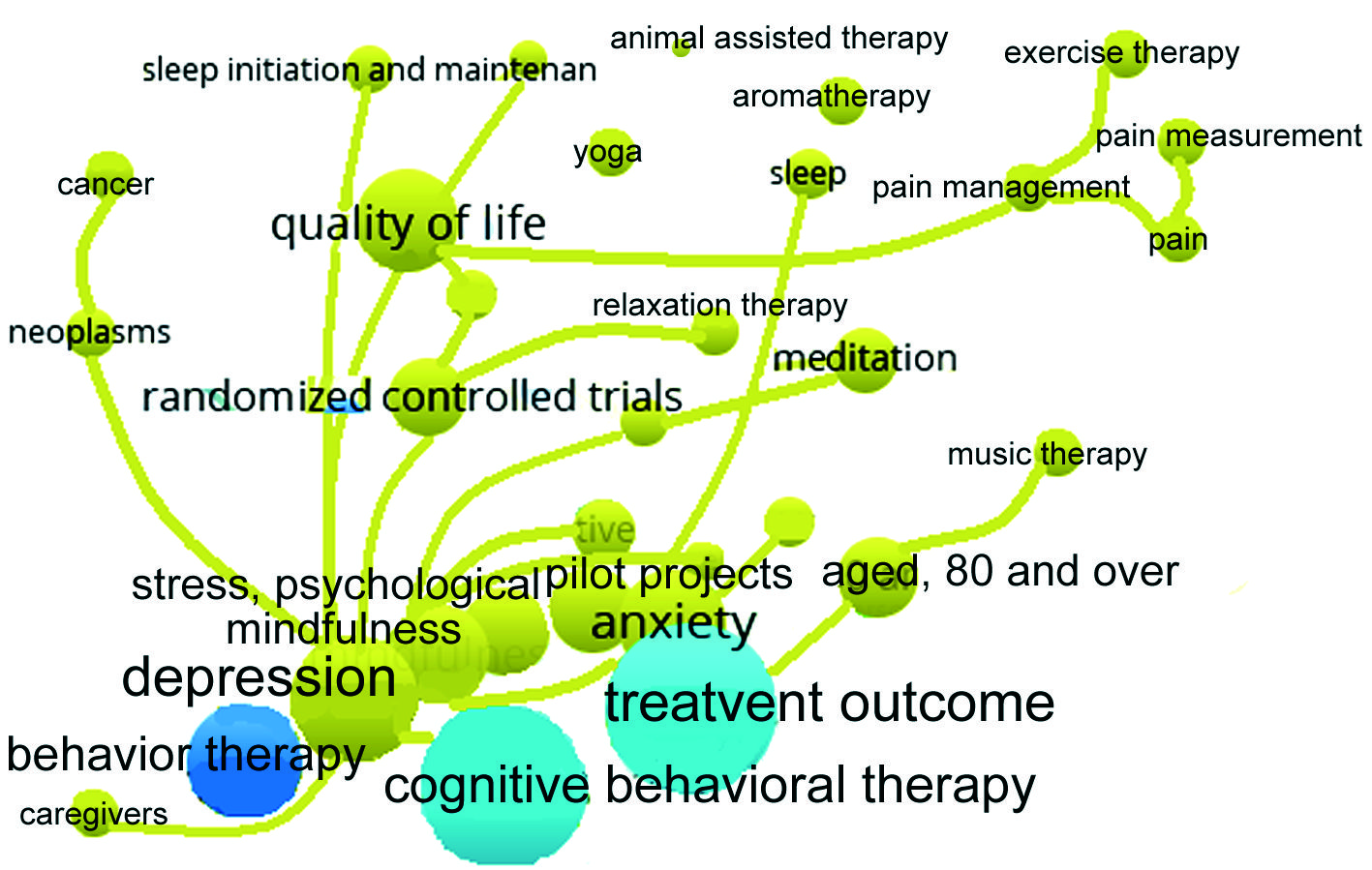 В 3-й кластер вошли статьи с 72 ключевыми словами с общей силой связи 17,1 %. Слова 3-го кластера встречались в 17 % статей общего массива. В сгруппированных статьях 3-го кластера авторы исследовали применение психологического воздействия (медитация, музыкальная терапия, арт-терапия, анималотерапия, йога и др.) с позиций доказательной медицины, лечение пациен-тов с хронической болью, тревожностью и депрессивными расстройствами, в том числе пациентов в возрасте 80 лет и более, и формирование здорового образа жизни (см. табл. 2). На рис. 6 показаны основные плеяды ключевых слов в 3-м кластере.