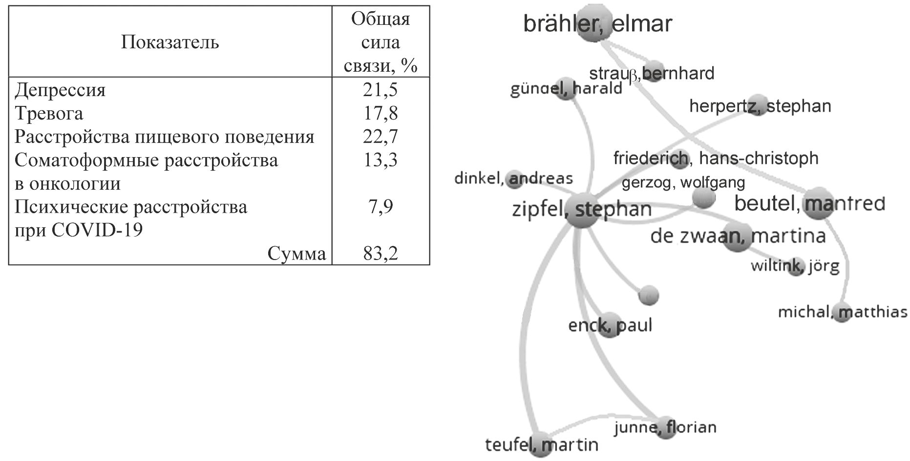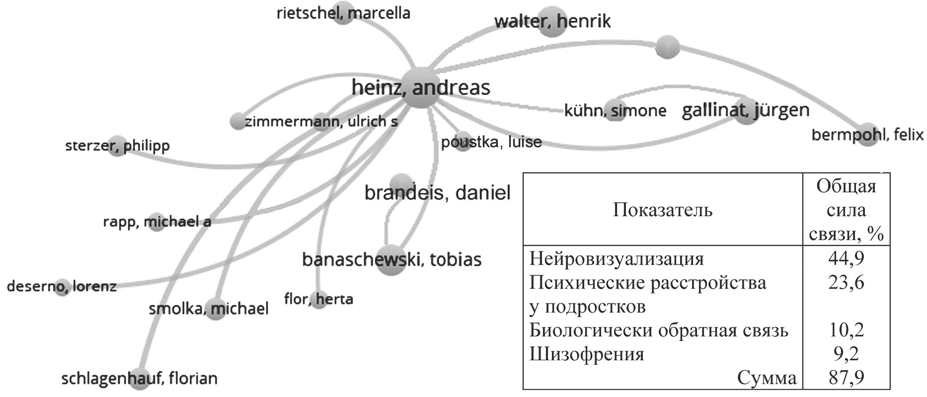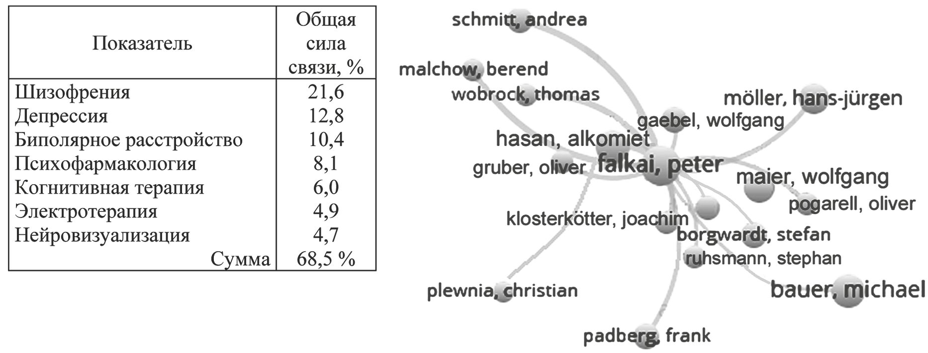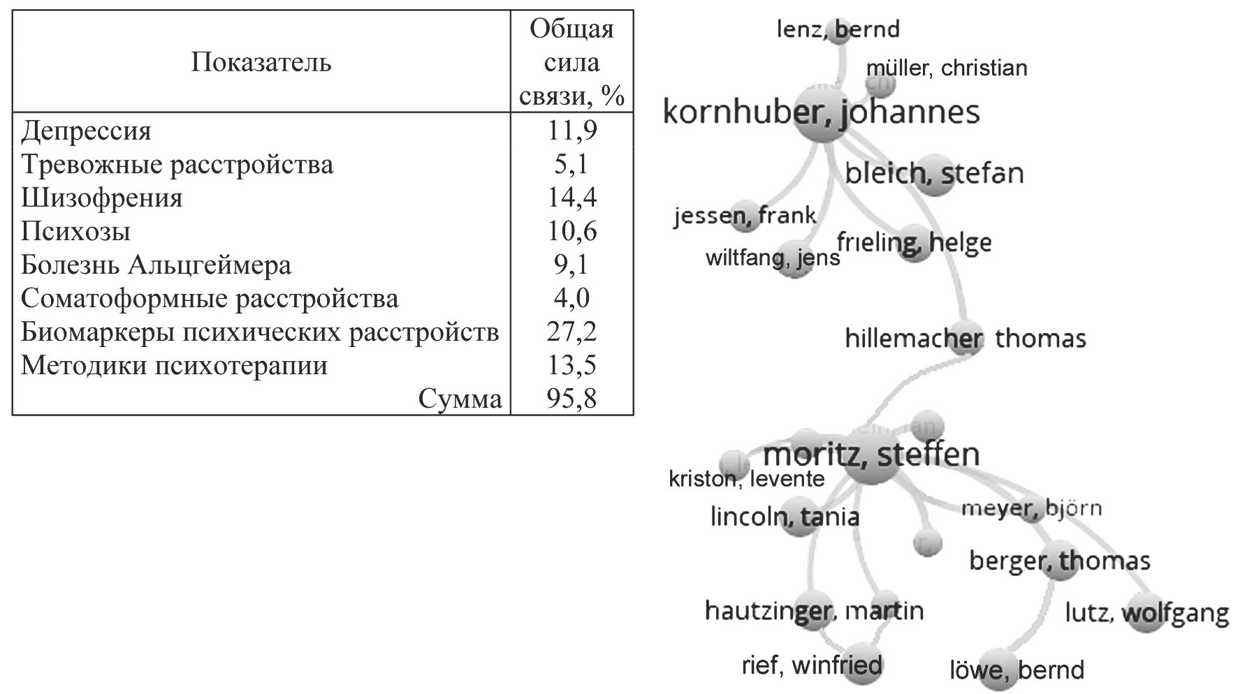 Из 14 проанализированных научных соавторств по психотерапии 10 были аффилированы с учеными из научных организаций Германии. Это необычно, так как значительная часть исследований по психотерапии была представлена учеными из США. Возможно, у этих исследователей было меньше статей в соавторстве. В последние годы отмечается также высокий уровень участия ученых из Германии в коллаборационных статьях [3] с несколькими десятками соавторов из разных стран мира. Феномен нуждается в дополнительном изучении.