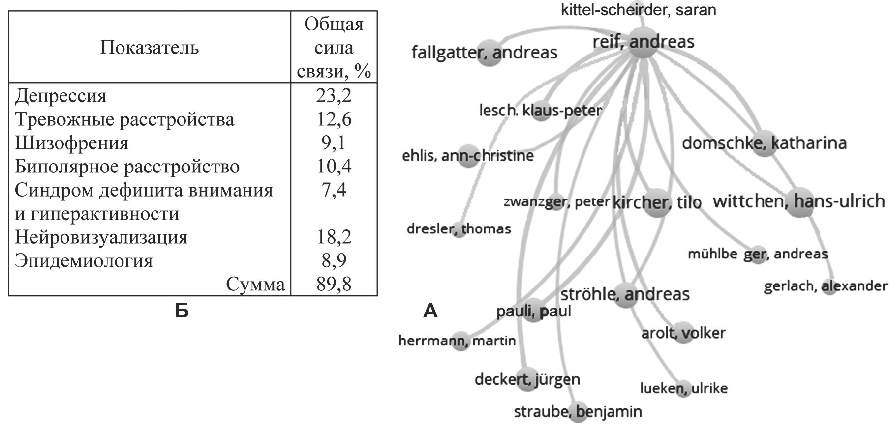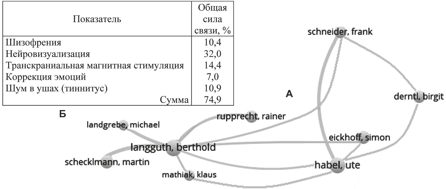 Рис. 20. Основные плеяды авторов (А) и общая сила связи ключевых слов (Б) в статьях 10-го кластера соавторства.