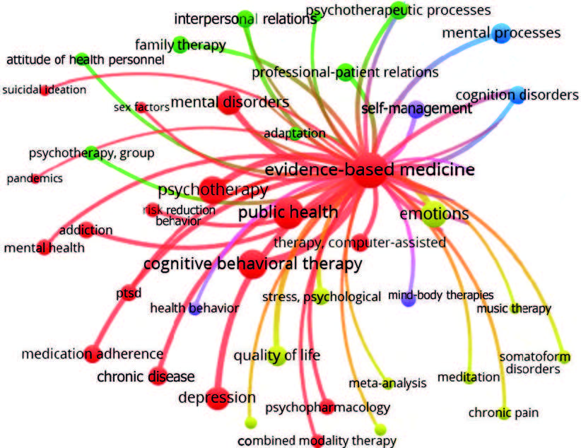 При помощи семантического анализа 532 ключевых слов, найденных с помощью программы VOSviewer в массиве 79,6 тыс. иностранных статей по психотерапии, проиндексированных с 2012 по 2021 г. в PubMed, создали 56 терминов, статьи которых распределились в 5 кластеров:
