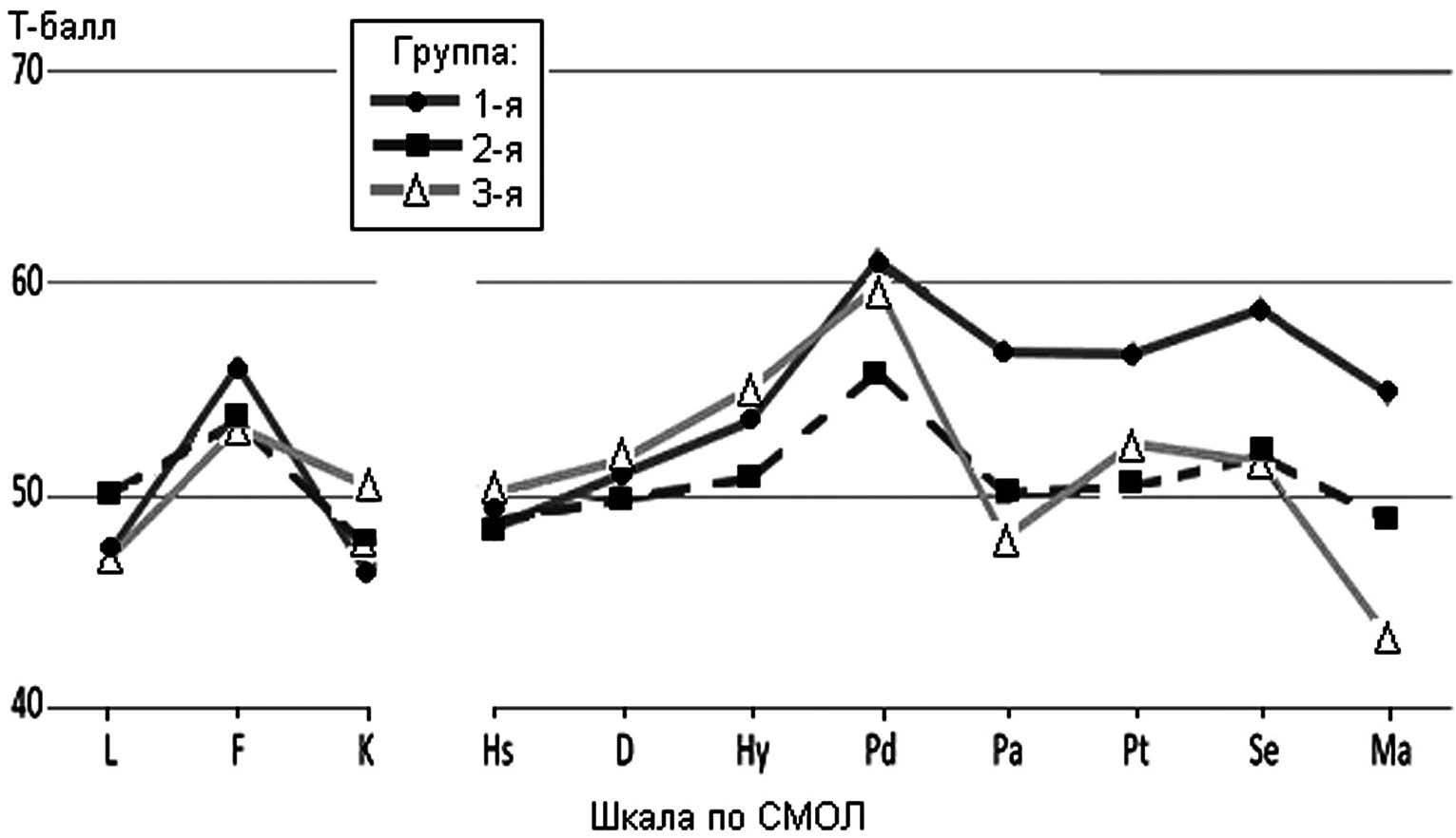 Для большей наглядности полученные данные представлены в виде профиля личности на рисунке. Кроме того, часть пациентов старалась представить себя с лучшей стороны (с целью добиться скорейшей выписки), что могло повлиять на результаты исследования. В связи с этим основным методом выявления типов акцентуаций и расстройств личности был клинико-психопатологический. При определении типа акцентированных радикалов в нашей работе внимание было сосредоточено на ведущих личностных особенностях, наиболее определяющих особенности реагирования индивидуума в большинстве жизненных ситуаций, а также результатах исследования по опроснику СМОЛ (Т-баллы выше 70).