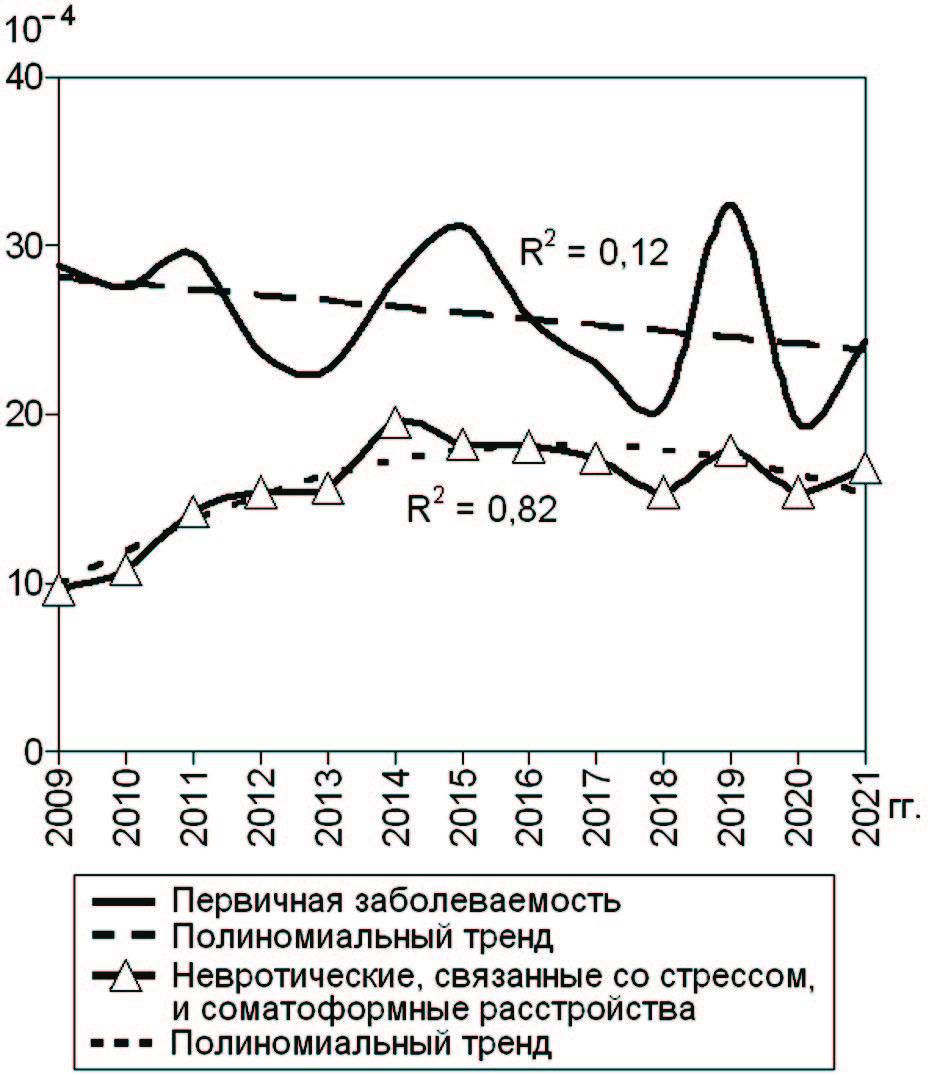 В тексте указаны среднегодовые уровни заболеваемости в виде средних арифметических показателей и их ошибок (M ± m). При округлении процентов до десятых величин сумма всей структуры расстройств может незначительно различаться. Развитие показателей изучили при помощи анализа динамических рядов и полиномиального тренда 2-го порядка с расчетом коэффициента детерминации (R2) [9]. Чем больше был R2 (максимальный 1,0), тем более приближался построенный тренд к объективным данным.