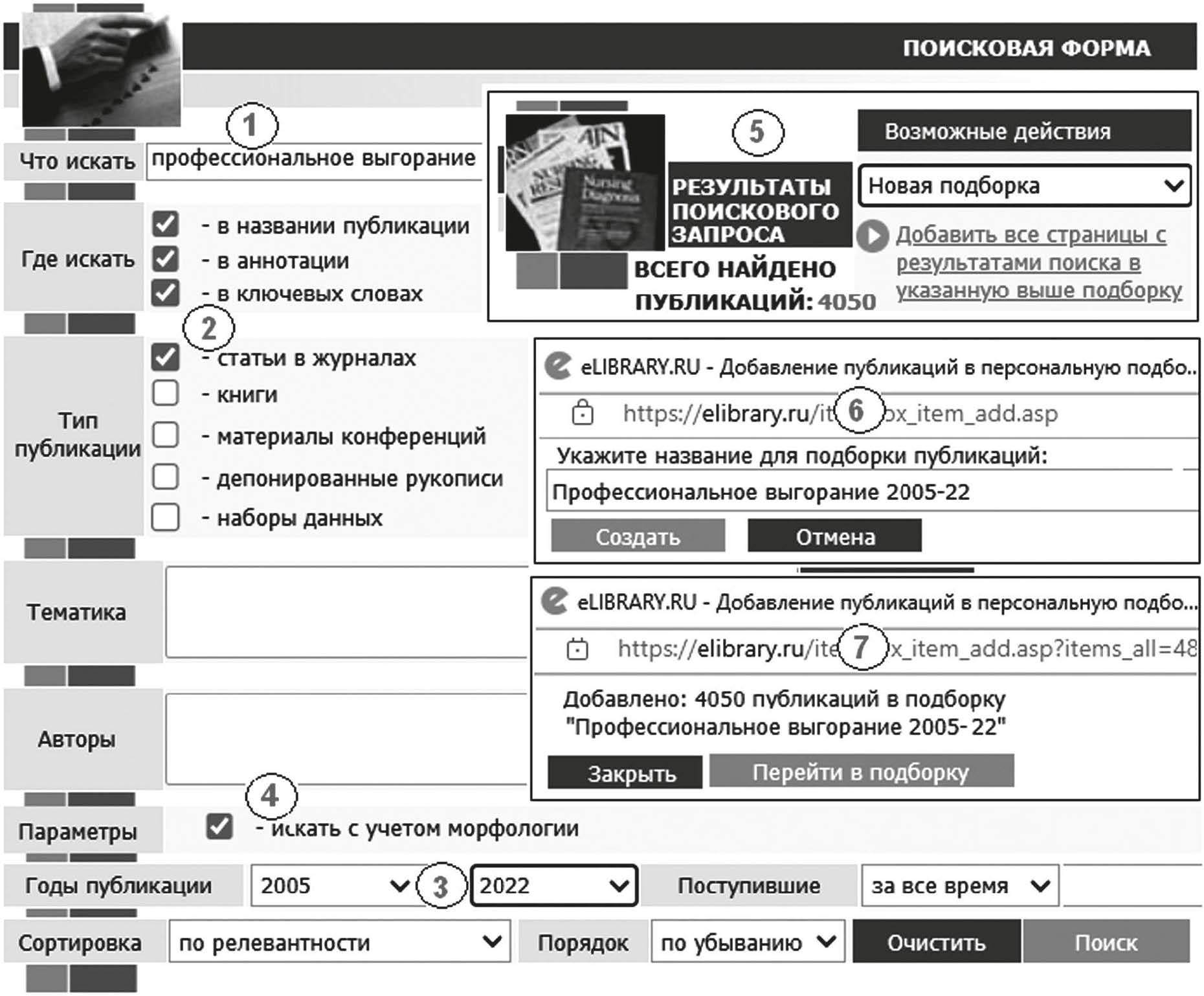 • годы – с 2005 по 2022 (см. рис. 3, п. 3). По поисковым словам с учетом морфологии (см. рис. 3, п. 4) и усеченным словам, например, профес* выгоран* без учета морфологии, создавали подборки публикаций (см. рис. 3, п. 5–7), которые затем объединили.
