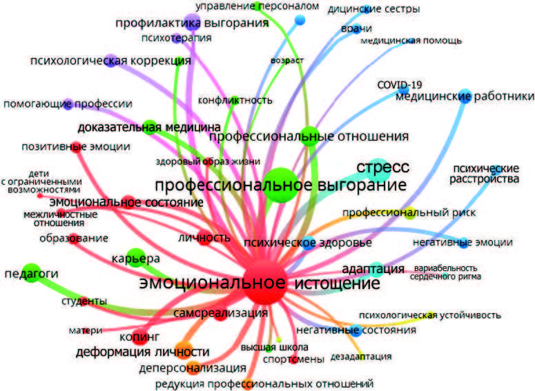 Кластерный анализ ключевых слов показал явно выраженное изложение профессионального выгорания в статьях с позиций профилактики и реабилитации. 1-й кластер объединял ключевые слова по эмоциональному истощению и факторам его предупреждающим в 36,3 % статей с 32,8 % общей силой связи, 2-й кластер – по профессиональному выгоранию и факторам его предупреждающим – в 29,1 и 28,3 %, 3-й кластер – по формированию последствий профессионального выгорания у медицинских работников – в 10,7 и 11,9 %, 4-й кластер – по влиянию стресса на формирование не только профессионального выгорания, но и на повышение стрессоустойчивости и адаптивности – в 8,5 и 9,7 %, 5-й кластер – по редукции личных достижений, деперсонализации и деформации личности – в 6,3 и 7,6 %, 6-й кластер – по профилактике профессионального выгорания – в 6,8 и 7,4 %, 7-й кластер – по вероятности развития профессионального истощения и профессионального выгорания у специалистов экстремальных профессий – в 2,3 и 2,4 % соответственно.