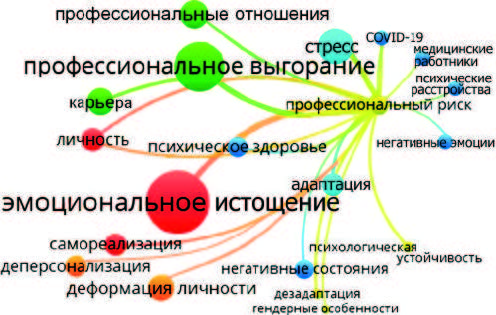 Цель – расширить информационные возможности по профессиональному выгоранию у практикующих специалистов и ученых, для чего изучить наукометрические показатели отечественных статей, изданных в реферируемых журналах за 18 лет с 2005 по 2022 г., провести семантический анализ ключевых слов и визуализацию их кластеров.