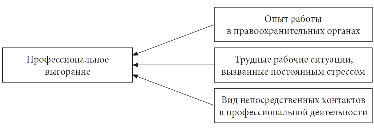 Феномен выгорания представляет собой специфическое психологическое явление, которое оказывает негативное влияние на психофизическое здоровье и эффективность деятельности специалиста, занятого в социальной сфере, в частности в правоохранительных органах [1]. Анализируя причины выгорания сотрудников правоохранительных органов, в первую очередь следует отметить наличие напряженной психоэмоциональной деятельности, которая заключается в том, что, работая в данной сфере, сотрудник постоянно находится в контакте с людьми. Это взаимодействие подкрепляется эмоциями, далеко не всегда позитивными, что, безусловно, нагружает нервную систему и вызывает усталость. Второй причиной является ненормированный рабочий график, неопределенность в организации и планировании труда. Третья причина – повышенная ответственность за исполняемые функции. Стоит указать еще два важных фактора – влияние психологического климата, который не всегда бывает благоприятным, а также отсутствие должного вознаграждения за работу. Существуют также и внутренние причины профессионального выгорания.