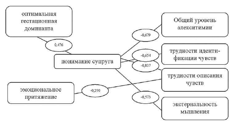 Корреляционные связи показателей алекситимии, оценки качества супружеских отношений по методике «Понимание, эмоциональное притяжение, авторитетность» и выраженности оптимальной гестационной доминанты по «Тесту отношений к беременности» И.В. Добрякова представлены на рис. 1. У женщин с алекситимическим радикалом выявлены взаимосвязи параметров алекситимии и низкой выраженности оптимальной гестационной доминанты, моделируемые представления о недостаточности понимания со стороны супруга. При этом сложности в общении с партнером (низкий уровень эмоционального притяжения) связаны с трудностями описания чувств самой женщиной. Взаимосвязи уровня алекситимии у беременных женщин и показателем авторитетности супруга статистически не подтверждены.