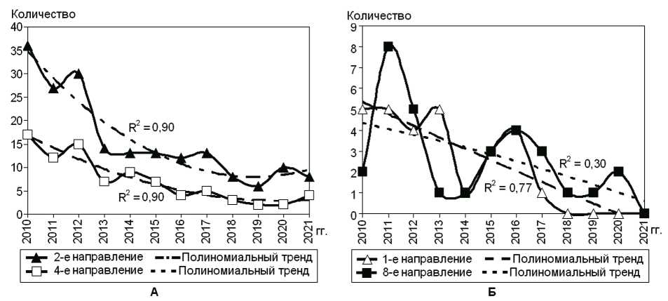 Рис. 2. Динамика диссертаций 2-го и 4-го направлений научных исследований (А), 1-го и 8-го – (Б)