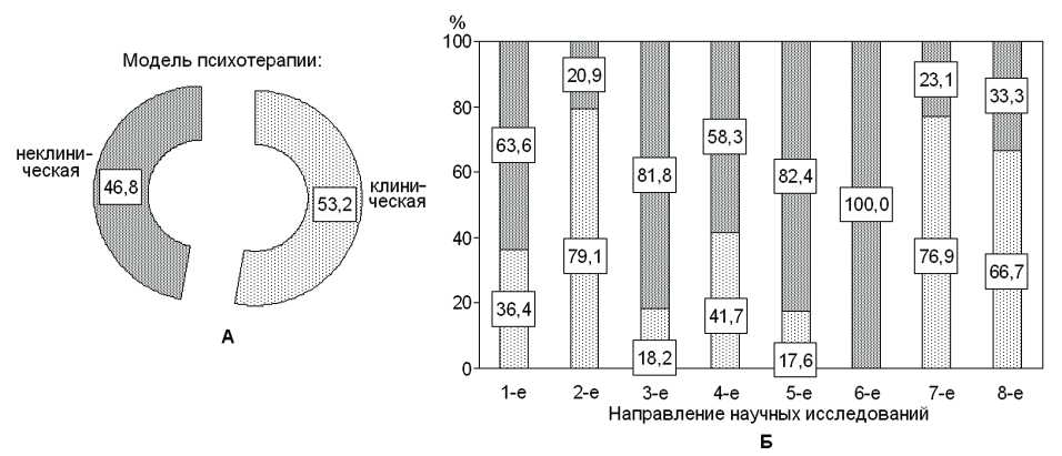 Рис. 6. Структура форм проведения психотерапии в общем массиве диссертаций (А) и в направлениях научных исследований (Б)