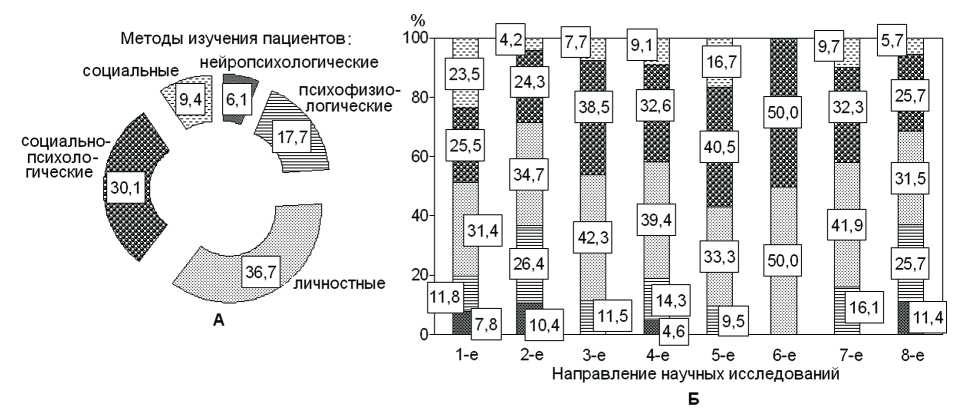 Методы изучения пациентов. В общем массиве при обследовании пациентов (клиентов) личностные методики использовались в 36,7 %, социально-психологические – в 30,1 %, социальные – в 9,4 %, нейропсихологические – в 6,1 % (рис. 9А). Как и следовало ожидать, структура использованных методик зависела от направления психотерапии и психологического воздействия: например, индивидуально-психологические характеристики пациентов содержались в названии 2-го направления, что обусловливало необходимость применения всех перечисленных методов; при оказании психологической помощи в экстремальных и кризисных ситуациях (3-е направление) акцент делался на использовании личностных и социально- психологических методик (см. рис. 9Б).