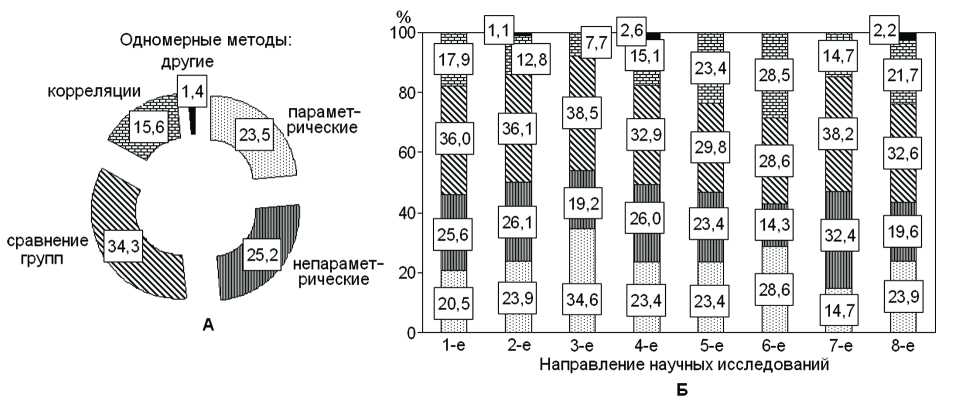 Рис. 10. Структура методов одномерной статистики в общем массиве диссертаций (А) и в направлениях научных исследований (Б)