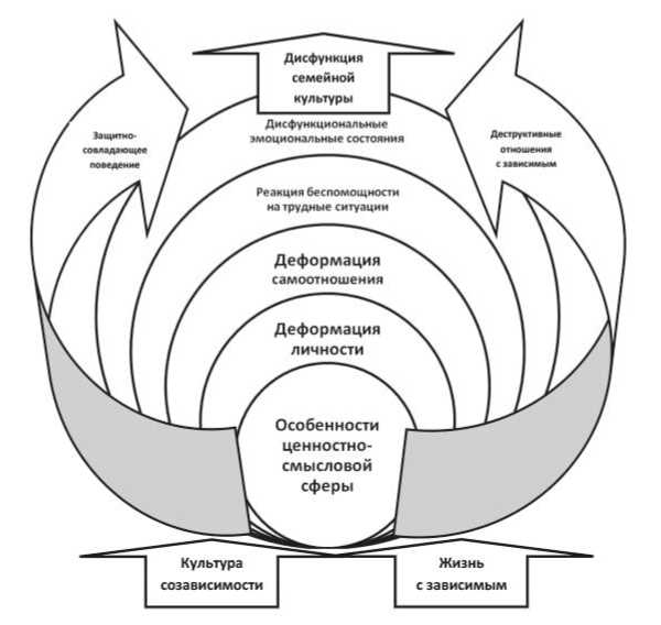 Согласно модели, созависимость – это неоднородный, многомерный, полифункциональный и динамичный биопсихосоциальный феномен, который обусловлен дефицитарностью личности, в частности деформированным самоотношением созависимых, и предполагает идентификацию с близким зависимым из-за дефицита целеполагания и последующую патологическую адаптацию к трудной жизненной ситуации. Созависимость проявляется на психофизиологическом, эмоциональном, ценностно- смысловом, социальном и поведенческом уровнях жизни человека и требует комплексной клинико-психологической интервенции.