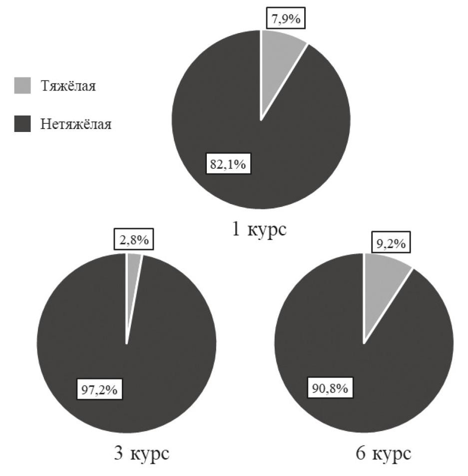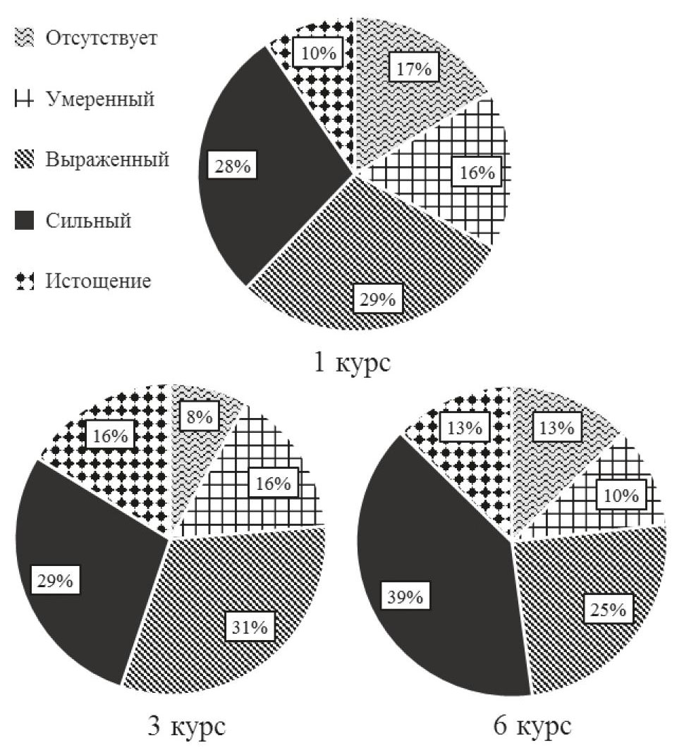 На сегодняшний день одним из лидирующих по факторам стресса видом профессиональной деятельности является врачебная. Специалисты медицинского профиля сталкиваются с трудностями еще на этапе обучения, что сказывается на их психологическом состоянии. На 1-м курсе студенты испытывают положительные эмоции, связанные с поступлением их в университет, однако со временем большинство студентов сталкиваются с новыми для них трудностями, что вызывает ряд психологических проблем. Уже к концу 6-го курса у студентов появляются элементы синдрома эмоционального выгорания, о чем свидетельствует пониженная работоспособность, а также рост числа вредных привычек [11]. К старшим курсам добавляются проблемы иного характера и происходит переключение внимания на другие проблемы.