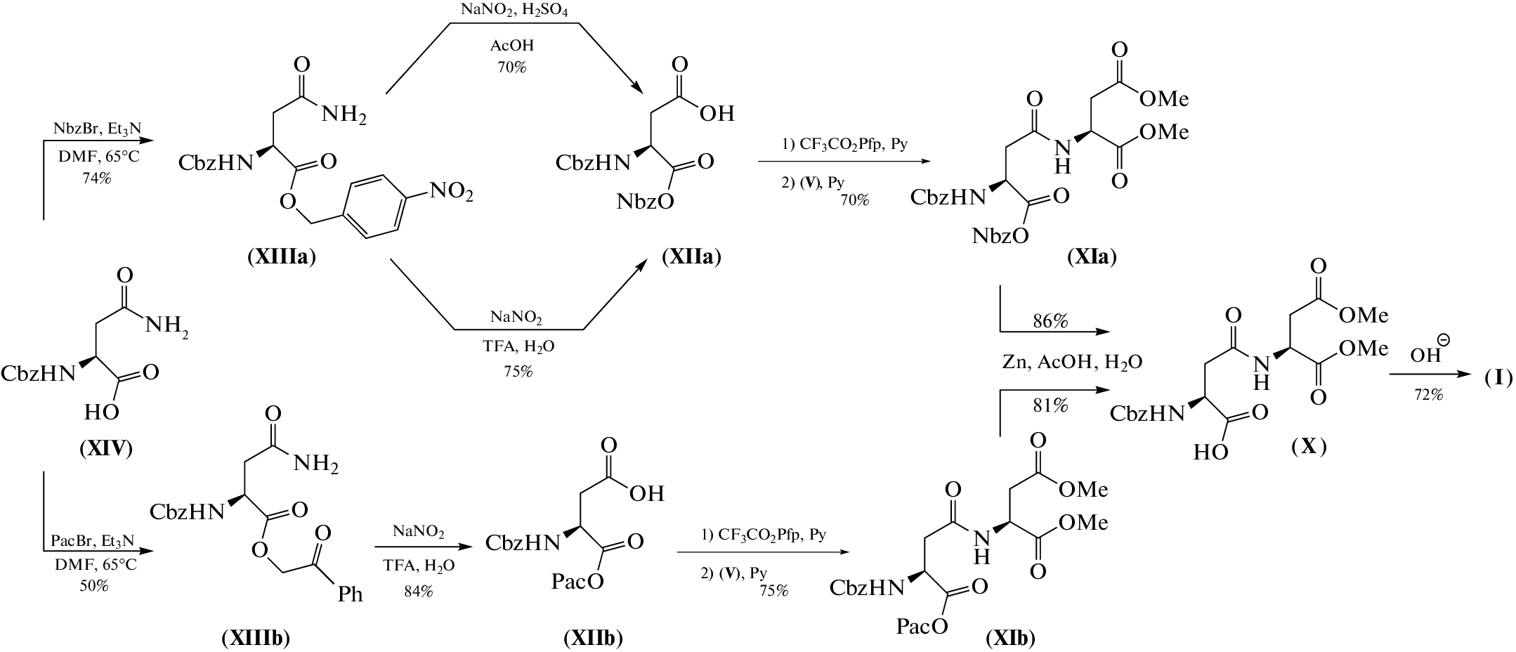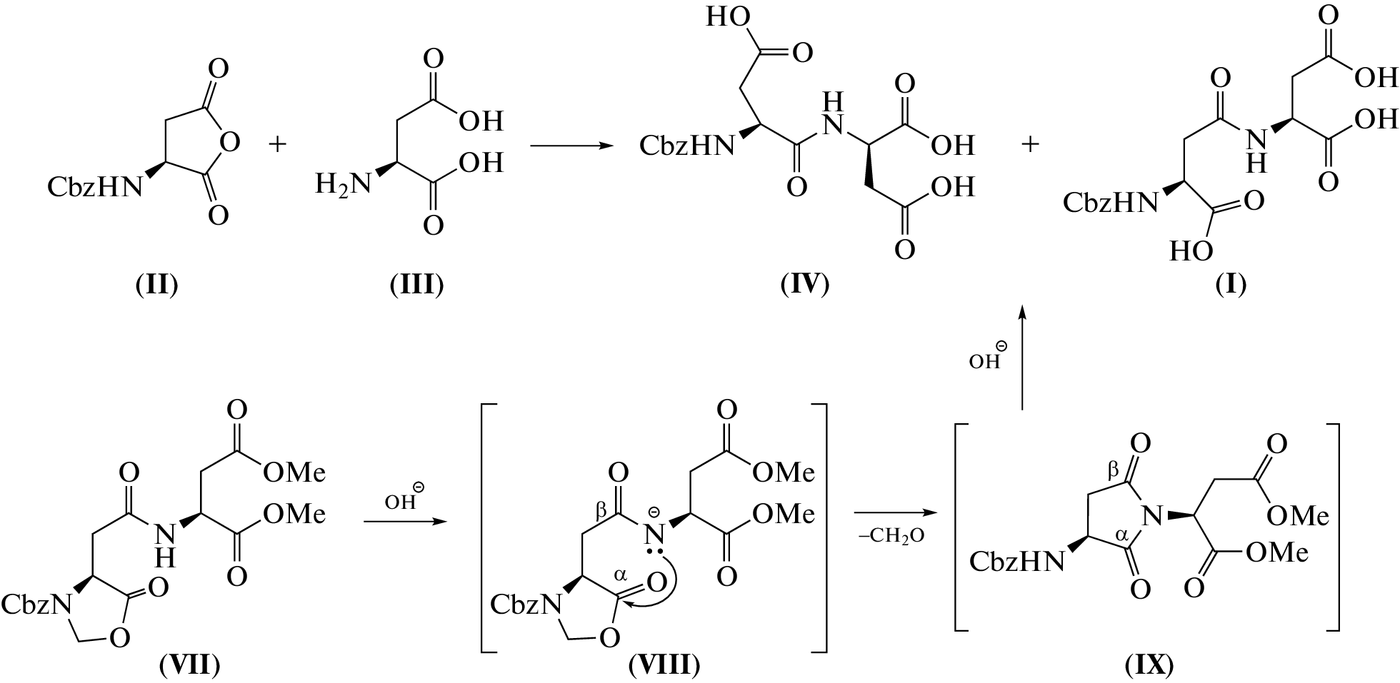 A new efficient synthetic approach for the preparation of Nα-protected β-L-aspartyl-L-aspartic acid dipeptide was elaborated. The distinctive features of the developed approach include utilization of readily available starting materials (Cbz-asparagine and dimethyl aspartate), aspartimide formation suppression employing electrostatic effect in a final deprotection step and an employment of a novel reagent (NaNO2/aqueous trifluoroacetic acid) for transformation of protected asparagine derivative into the corresponding aspartic acid. The developed method allowes preparation of aspartic acid derivatives that find application in carbohydrate polivalent interaction studies as well as in preparation of microbicidal dendrimeric constructs.