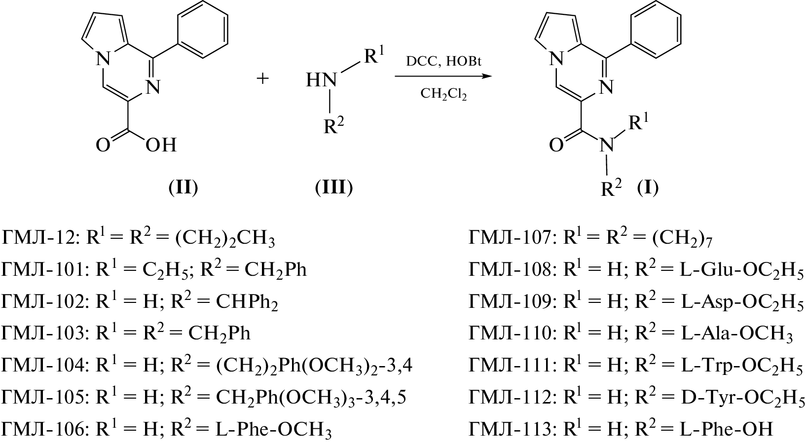 A new group of 1-phenylpyrrolo[1,2-a]pyrazine-3-carboxamides, in which substituents at the amide nitrogen atom are alkyl, benzyl or alkoxyphenylalkyl groups, amino acid residues or their derivatives, has been obtained in this work. The synthesized compounds have high theoretical affinities for the 18 kDa translocator protein (TSPO) and a favorable profile of ADMET characteristics, which makes them promising for drug development. Anxiolytic activity was detected for eight compounds at doses of 0.1–5.0 mg/kg when administered intraperitoneally under conditions of emotional stress in the open field test in Balb/c mice and in the elevated plus maze test in ICR mice. N-Benzhydryl-1-phenylpyrrolo[1,2-a]pyrazine-3-carboxamide was selected as a lead compound for further development as a potential anxiolytic agent, which showed the presence of anti-anxiety activity in a wide range of doses in both tests used.