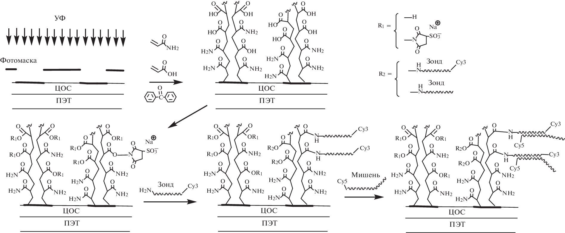 A method for manufacturing biochips by photolithography with hydrogel cells made of brush copolymers based on acrylic acid and acrylamide, fixed at one end on the surface of a polymer substrate has been developed. Hydrogel cells with reactive carboxyl groups were used for covalent immobilization of oligonucleotide probes. The effectiveness of the method was demonstrated in the hybridization analysis of DNA by targets of different lengths of the sequence site 7 of the exon of the human ABO gene.