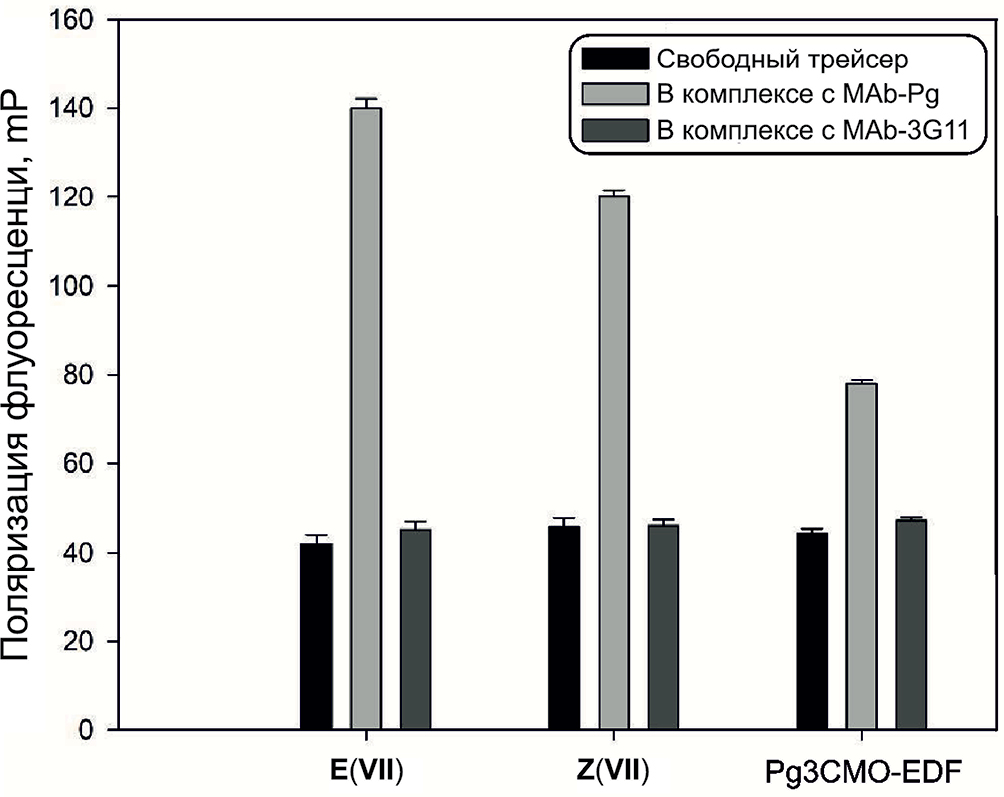 Анализ кривых изменения поляризации флуоресценции этих трейсеров при взаимодействии с моноклональным антителом к прогестерону показал быстрое увеличение сигнала и установление равновесия в системе в течение 2 мин. Конечные значения поляризации при связывании E/Z-изомеров трейсеров и соединения Pg3CMO-EDF [10, 11] приведены на рис. 3. Два новых изомерных трейсера Е(VII) и Z(VII) показали более высокий сигнал поляризации флуоресценции, чем Pg3CMO-EDF, что позволило разработать более чувствительный анализ. Кроме того, данные трейсеры специфично связывались только с моноклональным антителом к прогестерону (MAb-Pg) и не связывались с антителом MАb-3G11 к 1,3-β-D-нонаглюкану Glc9, описанному Мухаметовой с соавт. [21].