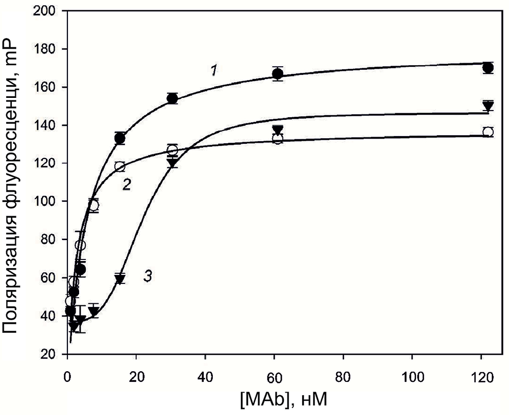 где mP – наблюдаемая степень поляризации образца, mP0 – поляризация свободного флуоресцентно-меченого антигена, mPmax – поляризация комплекса антитело–антиген при полном связывании, Q – отношение интенсивностей флуоресценции связанной формы к свободной. При измерении сигнала поляризации флуоресценции наших образцов интенсивность трейсера не изменялась при связывании с антителами, поэтому Q = 1.