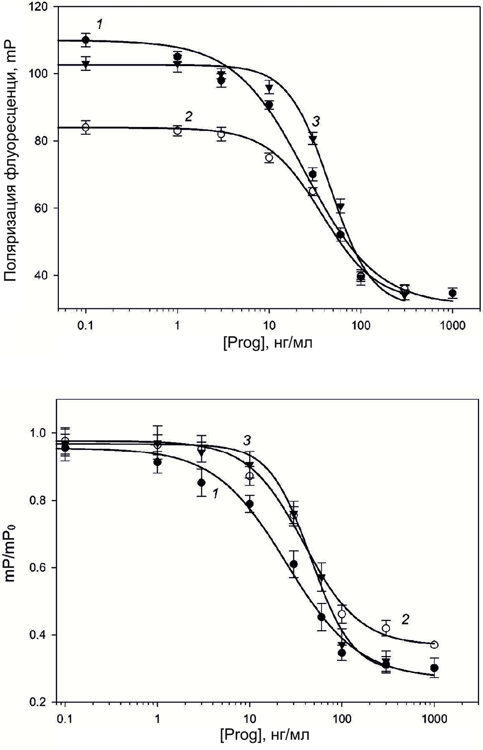 В стеклянные кюветы к 50 мкл стандартных растворов прогестерона добавляли 0.5 мл раствора одного из изомеров трейсеров Е(VII) или Z(VII) в концентрации 5 нМ и 0.5 мл раствора антитела в буфере А в рабочем разведении c концентрацией 24 или 29 нМ и выдерживали при комнатной температуре 4–5 мин. Затем измеряли поляризацию флуоресценции растворов. Измерения проводили трижды, результаты представляли в виде средних значений ± SD.