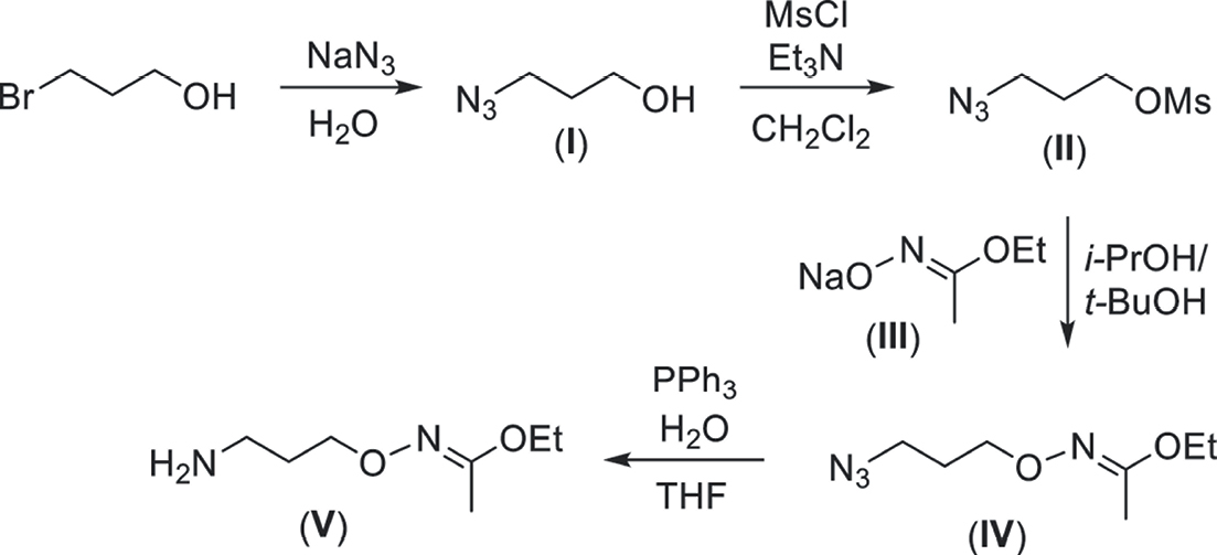 Введение защищенной аминооксигруппы в соединение (II) осуществляли с помощью реакции нуклеофильного замещения 3-азидопропилмезилата с натриевой солью этил-N-гидроксиацетимидата (III). Реакцию проводили с трехкратным избытком этой соли при кипячении в течение 20 ч в смеси изопропанола и трет-бутанола. В результате был получен N-(3-азидопропилокси)этилацетимидат (IV) с выходом 68%.