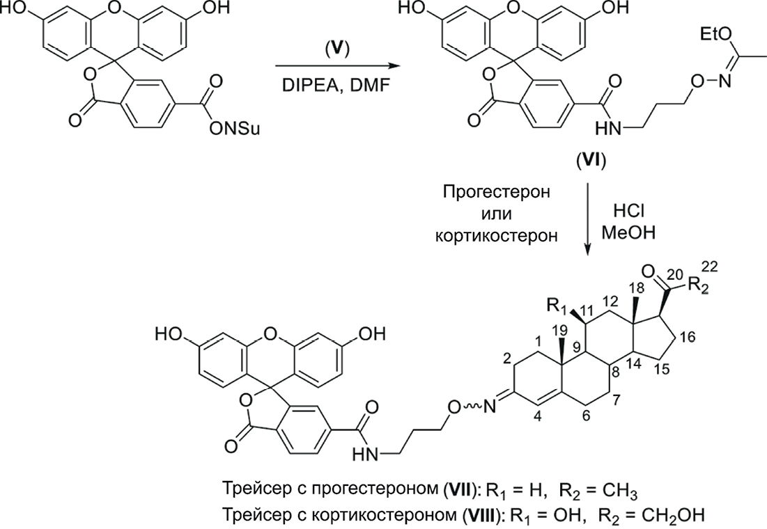 С этой целью получен реагент (V) с трехуглеродным линкером и защищенной терминальной аминооксигруппой. Его использовали для модификации флуоресцеина по карбоксильной группе и получения конъюгатов флуорофора с кортикостероном и прогестероном посредством оксимного лигирования [19] с одновременным снятием защитной группы. Полученные с помощью данного реагента трейсеры имеют более короткий линкер по сравнению с опубликованными ранее аналогичными соединениями (рис. 1).