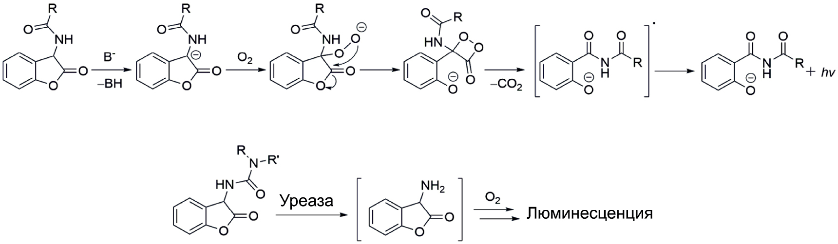 Схема 1. Механизм хемилюминесценции кумаранонов при действии кислорода, а также возможный механизм хемилюминесценции под действием уреаз.