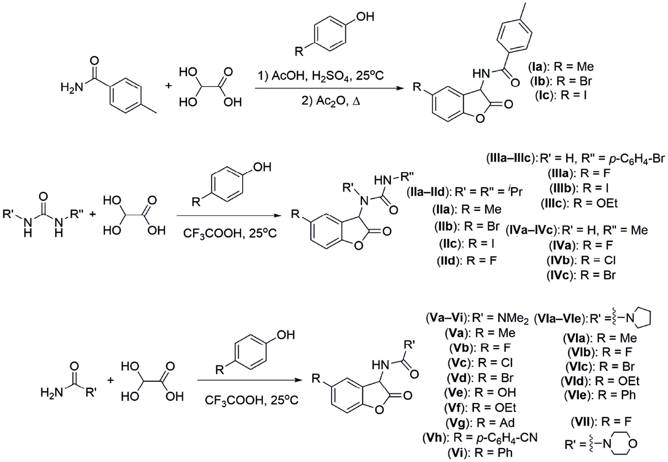 Мы синтезировали ряд производных 3-аминокумаран-2-она, который можно разделить на две группы: амидные производные и производные мочевины. Амидные производные – N-ацил-аминокумаран-2-оны – были получены из 4-метилбензиламида, дигидроксиуксусной кислоты и фенола (схема 2, соединения (Iа–с)). Исходные 4-метилбензиламид и дигидроксиуксусную кислоту растворяли в смеси уксусной и серной кислот, а через 30 мин перемешивания добавляли необходимый фенол. Полученный таким образом ациклический продукт выделяли, а затем при нагревании в уксусном ангидриде подвергали циклизации в лактоновый цикл. Производные второй группы – N-карбомоил-аминокумаран- 2-оны – были синтезированы путем смешивания различных замещенных карбамидов с дигидроксиуксусной кислотой в трифторуксусной кислоте с последующим добавлением фенола (схема 2, синтез соединений (II–VII)). Так были получены производные симметрично-замещенной 1,3-диизопропилмочевины (соединения (IIa–d)) и производные несимметрично замещенных карбамидов, которые, в свою очередь, можно разделить на производные моно- (соединения (IIIа–c) и (IVа–c)) и ди- (соединения (V–VII)) замещенных карбамидов (схема 2).