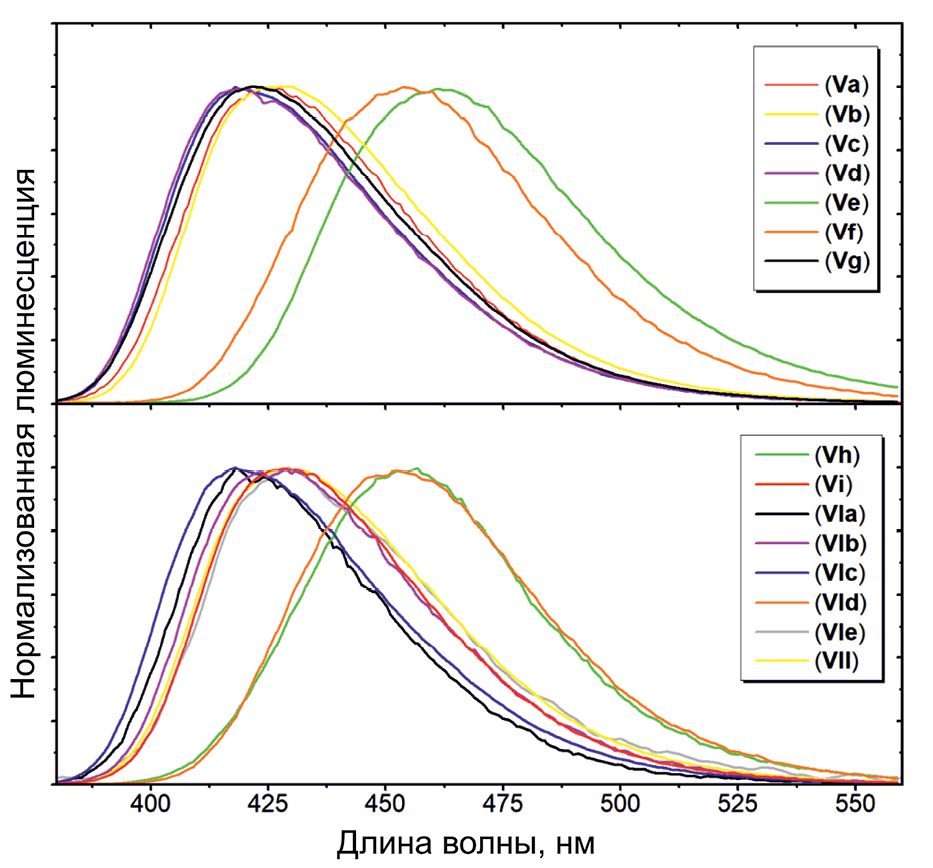 Мы изучили оптические свойства всех полученных соединений. Оказалось, что все вещества характеризуются поглощением с максимумами в области 258–297 нм (табл. 1). Некоторые соединения, такие как соединения (IIa, d), (IIIa, c), (IVa, b), (Ve, f, h, i), (VIa, d) и (VII), также ярко флуоресцировали с максимумами в области 310–358 нм (табл. 1). Остальные же соединения характеризуются крайне слабой флуоресценцией.
