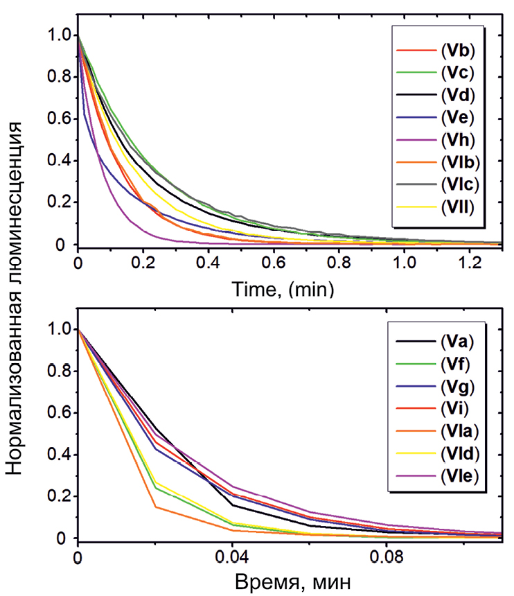 Затем мы изучили хемилюминесцентные свойства полученных соединений. В первую очередь растворы кумаранонов подвергли действию сильного органического основания – диазабициклоундецена (ДБУ) – в присутствии воздуха и зарегистрировали спектры люминесценции. Такой подход наиболее часто используется для изучения хемилюминесценции кумаранонов [5, 6]. Это позволило нам выявить соединения, которые обладают слабой люминесценцией в целом, и исключить их из дальнейших экспериментов. Так, мы установили, что производные 1,3-диизопропилмочевины (соединения (IIa–d)) в присутствии ДБУ не проявляют выраженной люминесценции. Остальные производные характеризуются заметной люминесценцией с максимумами в области ~420–500 нм (табл. 1). Наиболее интенсивную люминесценцию проявляют производные N,N-дизамещенных несимметричных мочевин (табл. 1, соединения (V–VII)). Заметным батохромным смещением максимума люминесценции отличаются соединения с расширенной системой кратных связей или содержащие электронно-донорные группы (табл. 1, рис. 1). Также было установлено, что соединения, содержащие атомы хлора, фтора или брома, характеризуются наиболее продолжительной люминесценцией (табл. 1, рис. 2).